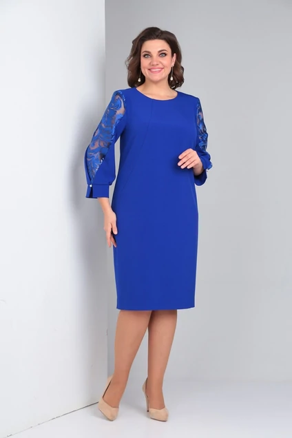 Платье женское полуприлегающего силуэта с застёжкой на "тесьму-молнию" в среднем шве спинки. Перед с рельефными швами от горловины к боковым швам. Спинка со средним швом, заказнчивающимся шлицей. Рукав втачной, одношовный, длиной 7/3, с притачной манжетой по низу, со вставкой из отделочной ткани. Горловина круглая, углублена, обработана обтачкой. Длина платья по спинке - 104см. Длина рукава - 52 см.