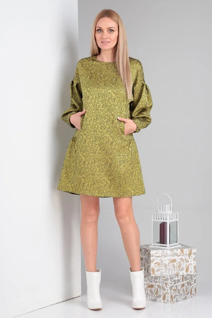 Стильное платье из жаккарда с широким воланом со сборкой на спинке. Рукава с приспущенной проймой, со складками по окату, внизу на резинке. Застежка на потайную молнию в среднем шве спинки. Длина платья - 92 см.