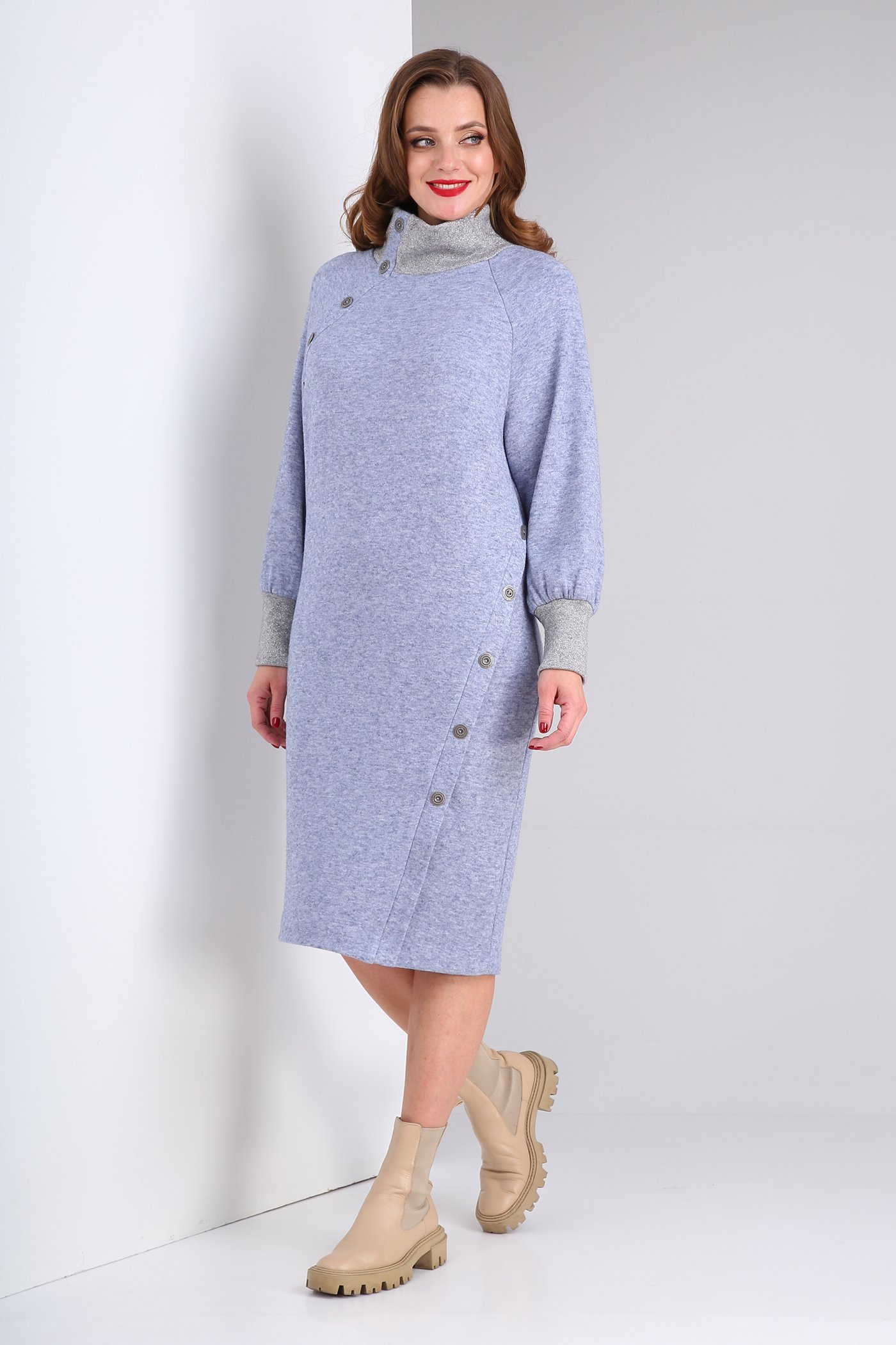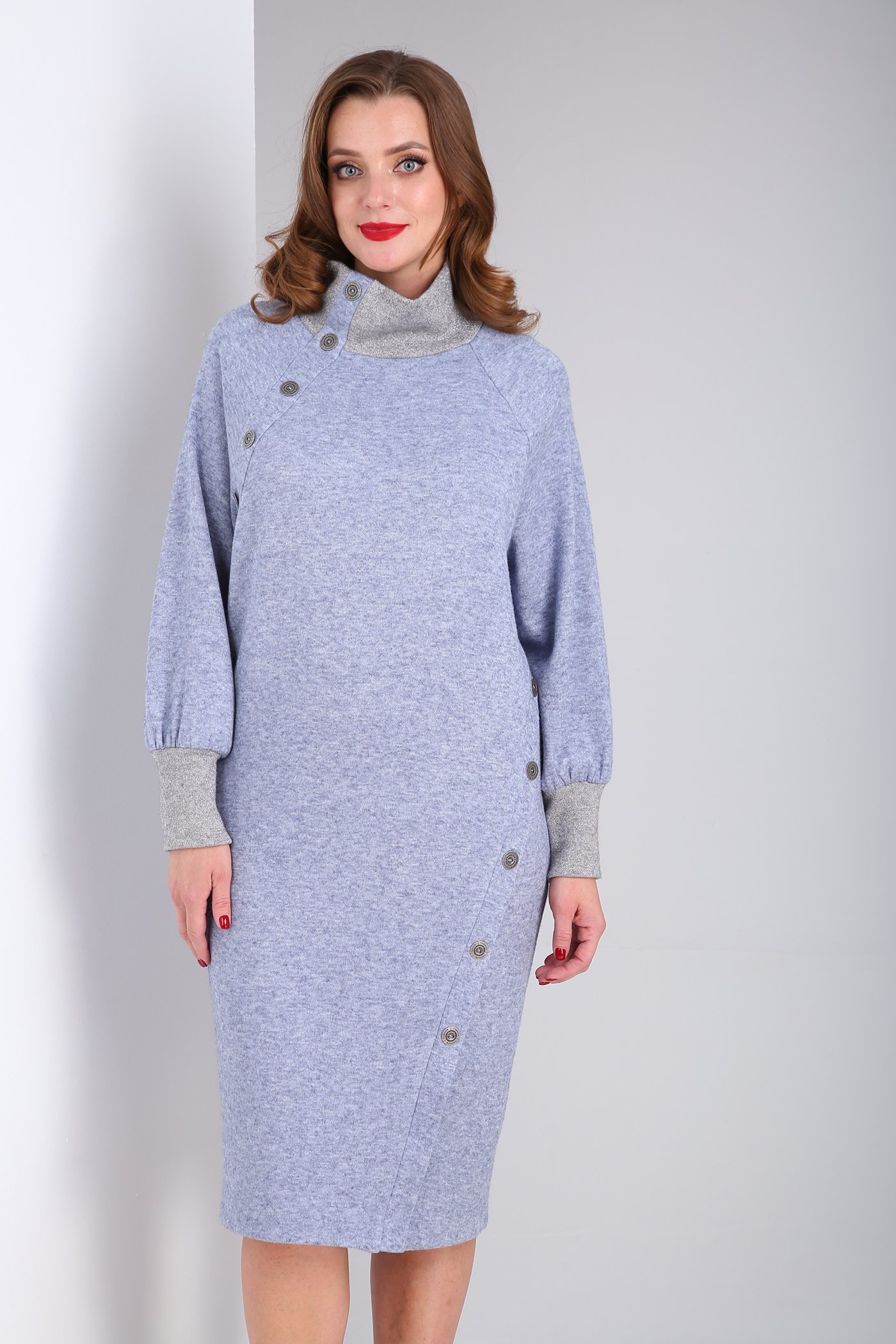 Платье из мягкого трикотажного полотна. Вырез горловины оформлен объемным воротником-"стойка". Спереди ассиметричные планки с декоративными пуговицами. Рукава длинные, присобраны на широкой манжете. Длина платья - 110 см.