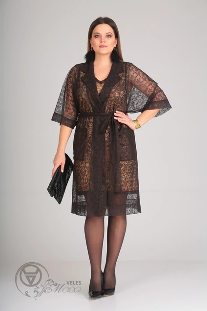 Комплект женский состоящий из кардигана и платья.Платье полуприлягающего силуэта с V-образным вырезом горловины.Без рукавов.По переду горловины и низу изделия отделка.Кардиган прямого силуэта с втачным,спущеным рукавом 3/4.Перед с лацканами и воротником.По переду кардигана настрочные карманы.Изделие с поясом.Длина платья 91,5см,длина кардигана 104,5см.