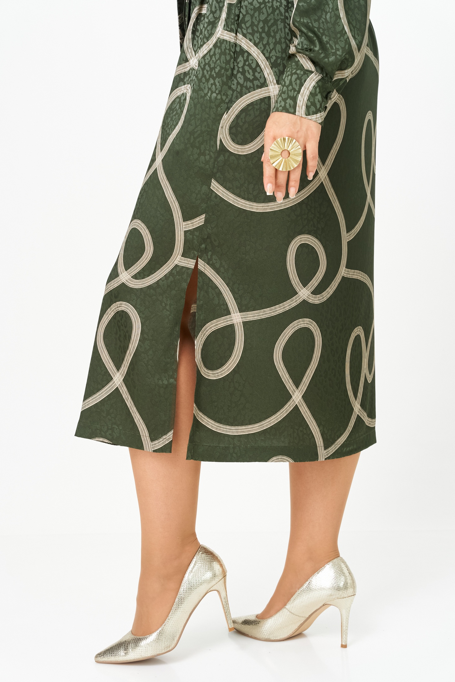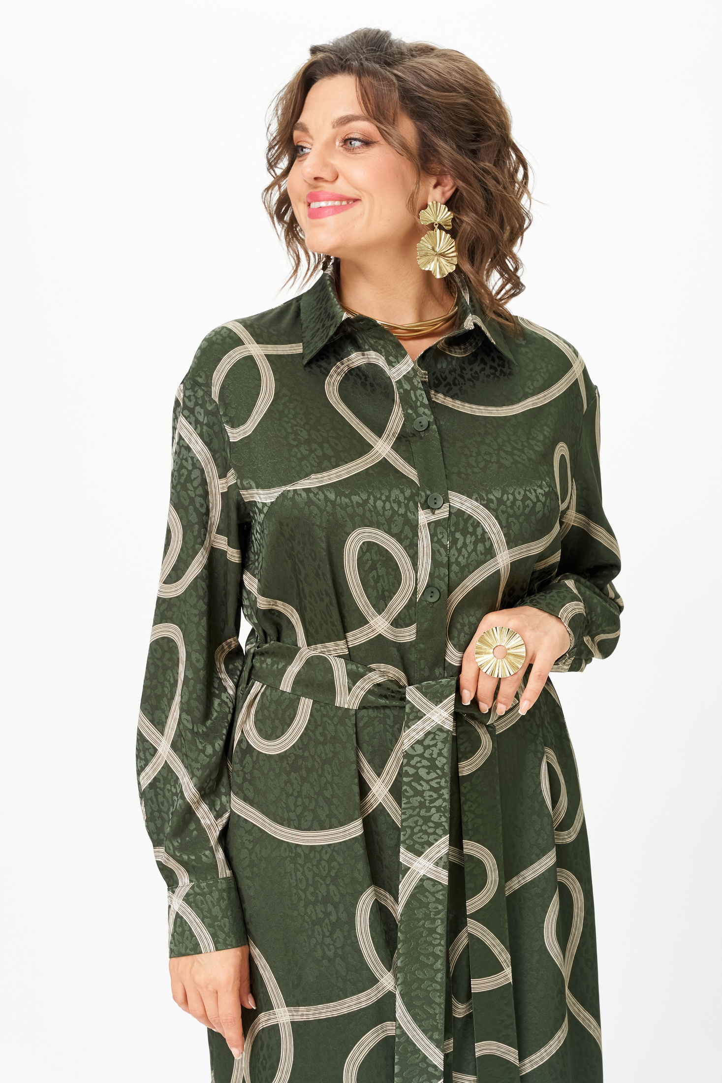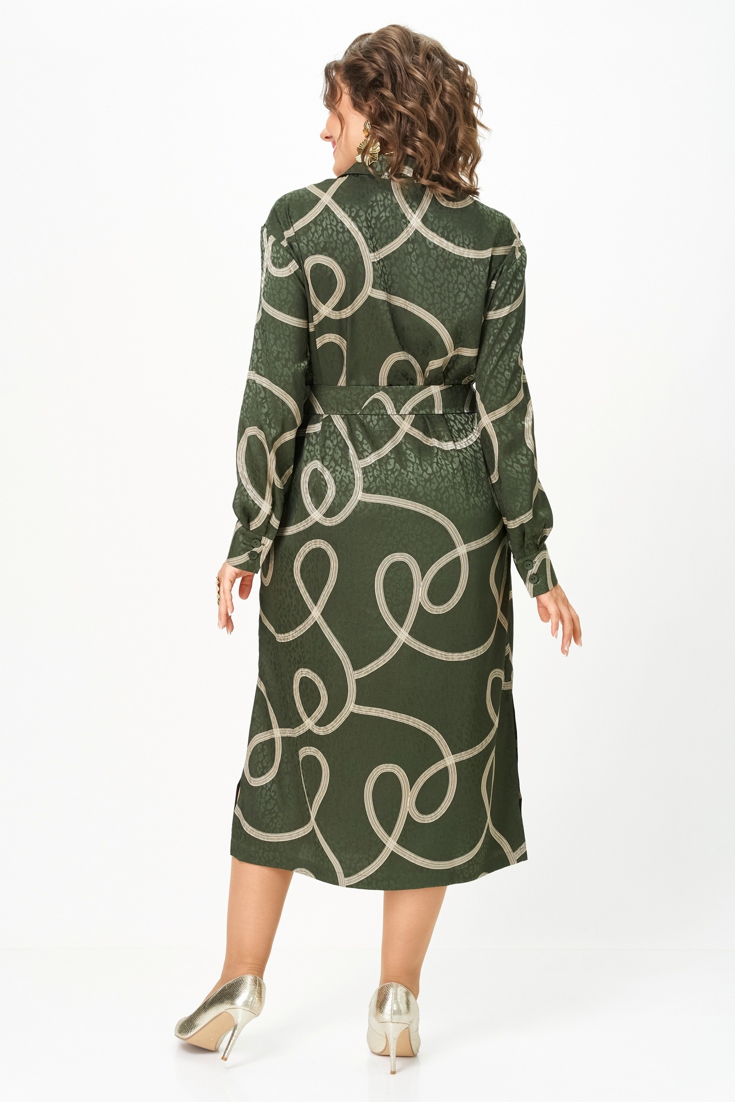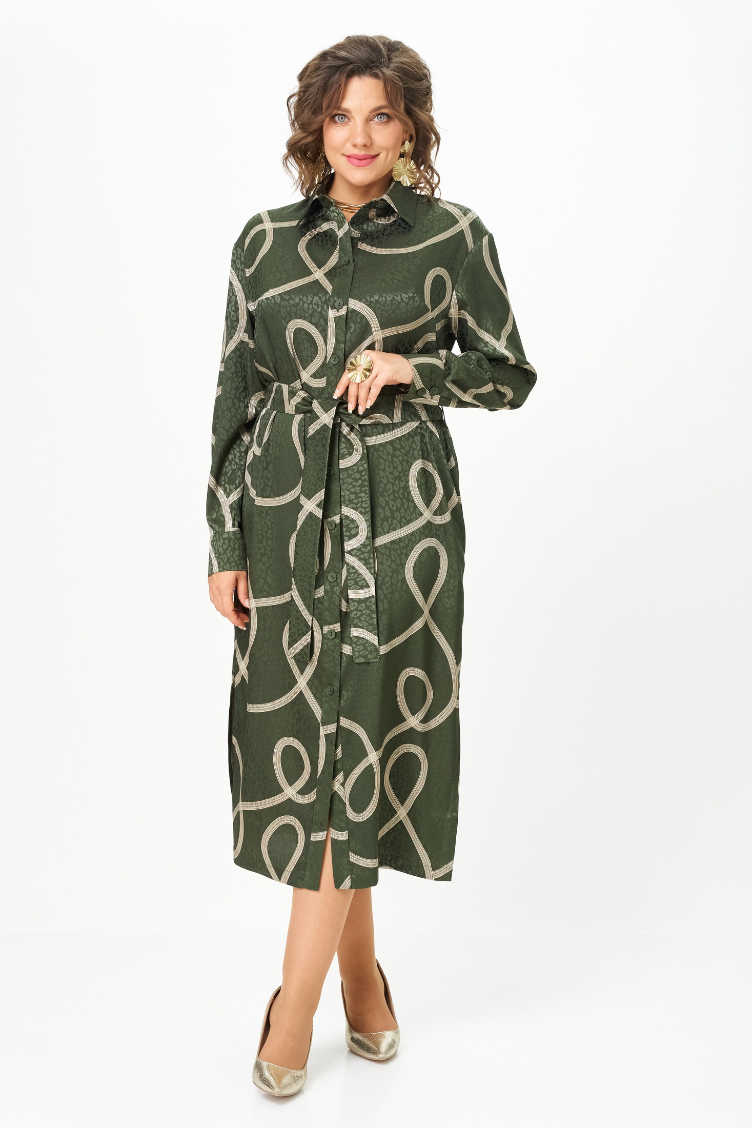 Платье-рубашка от VIPPRIMO -это идеальное сочетание стиля и комфорта. Сшитое из вискозы с эффектом шелка, оно обладает мягкостью и изяществом. Оливковый фон ткани эффектно контрастирует с молочным принтом, создавая выразительный и запоминающийся образ. Струящийся прямой силуэт можно легко изменить с помощью пояса из той же ткани, который акцентирует талию и создаёт более женственный облик. Воротничок на стойке, по переду сделаны вытачки на грудь. Модель с пуговицами по всей длине спереди и соблазнительными разрезами по бокам. Пройма углубленной формы, рукав рубашечного типа, по низу со складками на притачной манжете с застежкой на петли и пуговицы. В боковых швах карманы. Состав ткани максимально комфортен для тела.