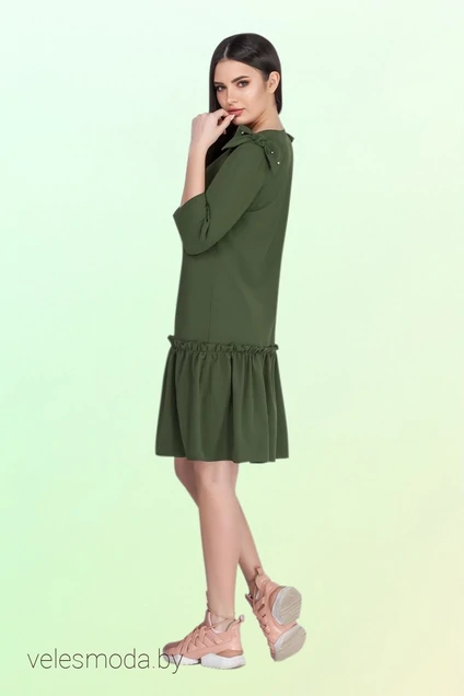 Платье женское с притачным, присборенным поясом и декором из бантов, декорированных бусинами. Спереди вытачки. Спинка цельная. По низу изделия настрочен волан. Рукав втачной, одношовный, длиной за локоть.