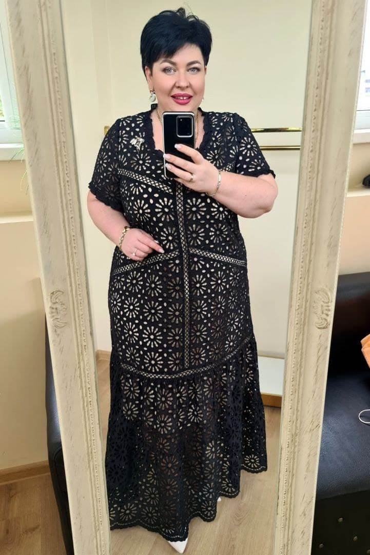В этом сезоне никак без макси длины! Посмотрите какое эффектное и стильное платье! Идеально по фигурке и визуально стройнит! Платье А-силуэта. По переду горловина округлой формы, в горловину вставлена рюша на сборке, кокетки со вставками из тесьмы, по центру разрез со вставкой из кружевной тесьмы, нагрудные вытачки, наклонные подрезы со вставками из тесьмы, по низу подрез со вставкой из кружева, воланы на сборке, низ с фестонами, нижний волан на просвет. Спинка с округлой горловиной, рюша на сборке, в центральной части подрез со вставкой из тесьмы, кокетки с тесьмой, нижний подрез со вставкой из кружевной тесьмы, воланы на сборке, нижний волан на просвет. Платье на подкладке телесного цвета. Рукав втачной, одношовный, по низу рукава рюша на сборке. Длина рукава 24 см (р.50,52,54), 26 см (р.56,58,60). Длина платья 133 см (р-р 50-54), 135 см (р-р 56-60).