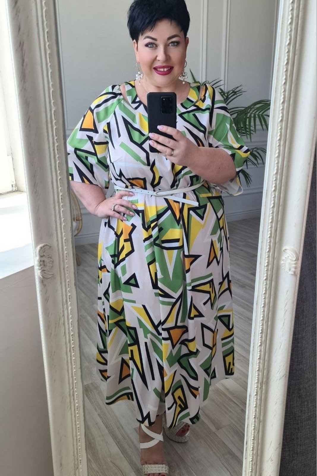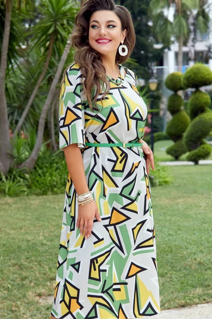 Стильное решение на каждый день - платье с модным принтом выделит вас на фоне окружающих. Его фасон и расцветка специально подобраны для жаркого лета, не сковывает движений и приятно прикасается к телу. За счёт текстуры ткани платье не придется расправлять каждый раз после вставания с места. Платье без подкладки, А-силуэт позволяет умело замаскировать недостатки. Горловина платья V-образная с отлетной обтачкой и вырезами по плечам. Рукав в платье реглан с лёгкой сборкой по окату, широкий. В качестве дополнительного декоративного элемента используется пояс, который поможет подчеркнуть достоинства фигуры. Обращаем ваше внимание, что фурнитура может незначительно отличаться от фото!!! Длина платья от высшей точки плечевого шва до низа 117 см (р 50-54), 119 см (р 56-60). Длина рукава 38 см (р 50-54), 39 см (р 56-60).