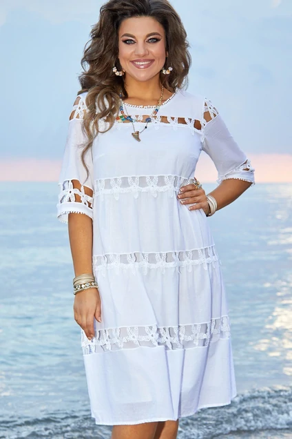 Состав: подкладка 100% хлопок. Никаких сомнений – это хитовая модель точно станет яркой ноткой вашего летнего гардероба! Свободный силуэт и оригинальная вышивка на хлопке создают нежный образ. Платье А – образного силуэта на подкладке. По переду расположены нагрудные вытачки, горизонтальные подрезы со вставками из хлопокового гипюра, вырез горловины округлой формы с кружевной тесьмой. Спинка с горизонтальными подрезами, на горловине вырез с завязками. Рукав втачной, по низу притачано кружево. Длина платья 108 см (р.48,50), 112 см (р.52-56), 114 см (58-62). Длина рукава 41см (р.48,50), 42см (52-62).
