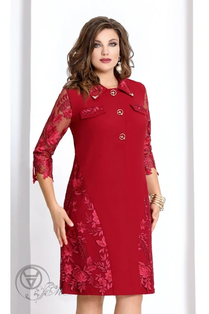 Платье женское прямого силуэта. Перед с центральной застежкой на пробивные кнопки, с нагрудными вытачками, средним швом, настроченными отлетными клапанами. Воротник рубашечного типа с наложенным кружевом и декоративными элементами. Спинка со средним швом, вытачками от среза горловины. По боковым швам от линии талии клинья, с наложенным кружевом. Рукав втачной одношовный, с декоративной притачной патой, застегивающейся на пуговицу. Длина рукава 50 см. Длина изделия 103 см.