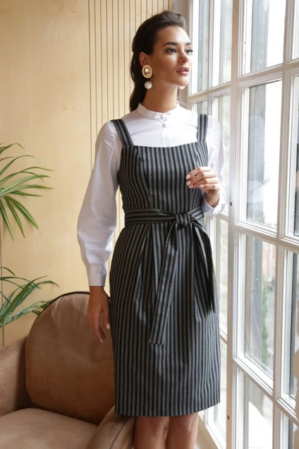Сарафан женский, полуприлегающего силуэта. Выполнен из высококачественной поливискозы. Изделие на бретелях. Изделие разрезное по линии талии. Лиф переда с нагрудными вытачками. Юбка с встречными складками. Спинка разрезная, с средним швом. В который втачана потайная тесьма молния.
