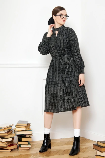 Платье женское, расширенное к низу, со сборкой по талии. Изделие выполнено из плательной ткани различных расцветок. Горловина на притачной стойке с застежкой на 2 навесные петли пуговицы. Рукав втачной с притачной манжетой и застежкой на петли и пуговицы. Перед отрезной, из 2х половинок со швом, и кокетками. А также вырезом у горловины. Спинка с средним швом. Юбка со сборкой и резинкой в шве притачивания с верхом.