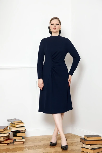 Платье женское, А-образного силуэта. Выполнено из высококачественного трикотажа. Горловина на притачной стойке. Рукав втачной. Перед с притачной фигурной деталью справа. Слева он состоит из 2х деталей, которые собраны в мягкие складки. Спинка со швом по середине. Низ юбки и рукава обработан на спецмашине. Длина по спинке-106