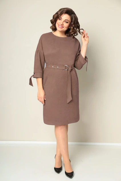 Нарядно-повседневное платье прямого силуэта из трикотажа с эффектом велюра. Рукав цельнокроеный с отрезом, складками и манжетой с полукольцами. По спинке- застежка на молнию. Длина платья по центру спинки 99 см. Пояс с застежкой на полукольцо и декоративными кнопками в комплекте.