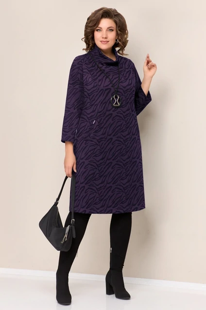 Комфортное платье из трикотажной ткани силуэта легкая трапеция. Рукав платья цельнокроеный длиной 7/8, горловина- мягкая стойка. Спереди-потайные карманы.. Длина платья- 105 см по центру спинки. Украшение в виде подвески- в комплекте изделия.