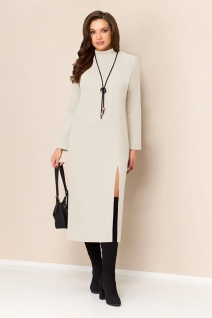 Удлиненное платье из трикотажа с разрезом полуприлегающего силуэта. Рукав платья втачной, длина рукава- 61см. Горловина- мягкая полустойка, по спинке- застежка на потайную молнию. Длина платья- 102 см по центру спинки. Украшение в виде оригинальной подвески в комплекте изделия.