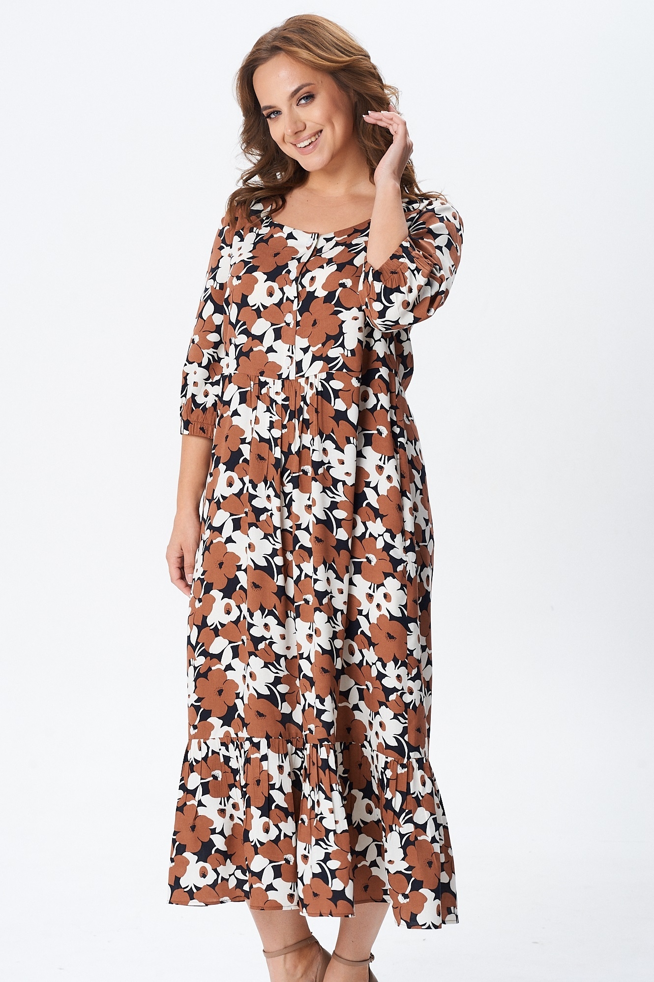 Стильное, комфортное платье свободного силуэта, отрезное чуть выше линии талии. Снизу волан, добавляющий изюминку образу. Рукав укороченный, по низу эластичная тесьма. Длина рукава 42 см. В верхней части платья застежка на пуговицы. В боковых швах расположены карманы. Длина изделия от плеча по спинке 130 см (для роста 164 см)/133 см ( для роста 170 см). Это платье станет отличным выбором для повседневной жизни или особого случая.