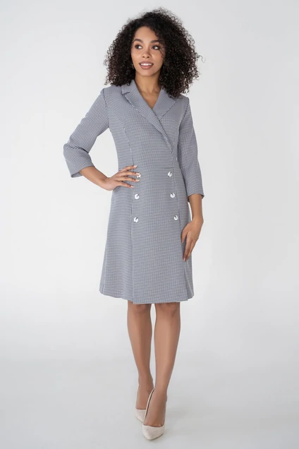 Идеальное офисное платье, строгое, но в то же время стильное и женственное. Платье женское полуприлегающего силуэта, отрезное по линии талии, с имитацией смещенной (двубортной) застежки, длиной до колена, на подкладке. Платье повседневное, демисезонное.