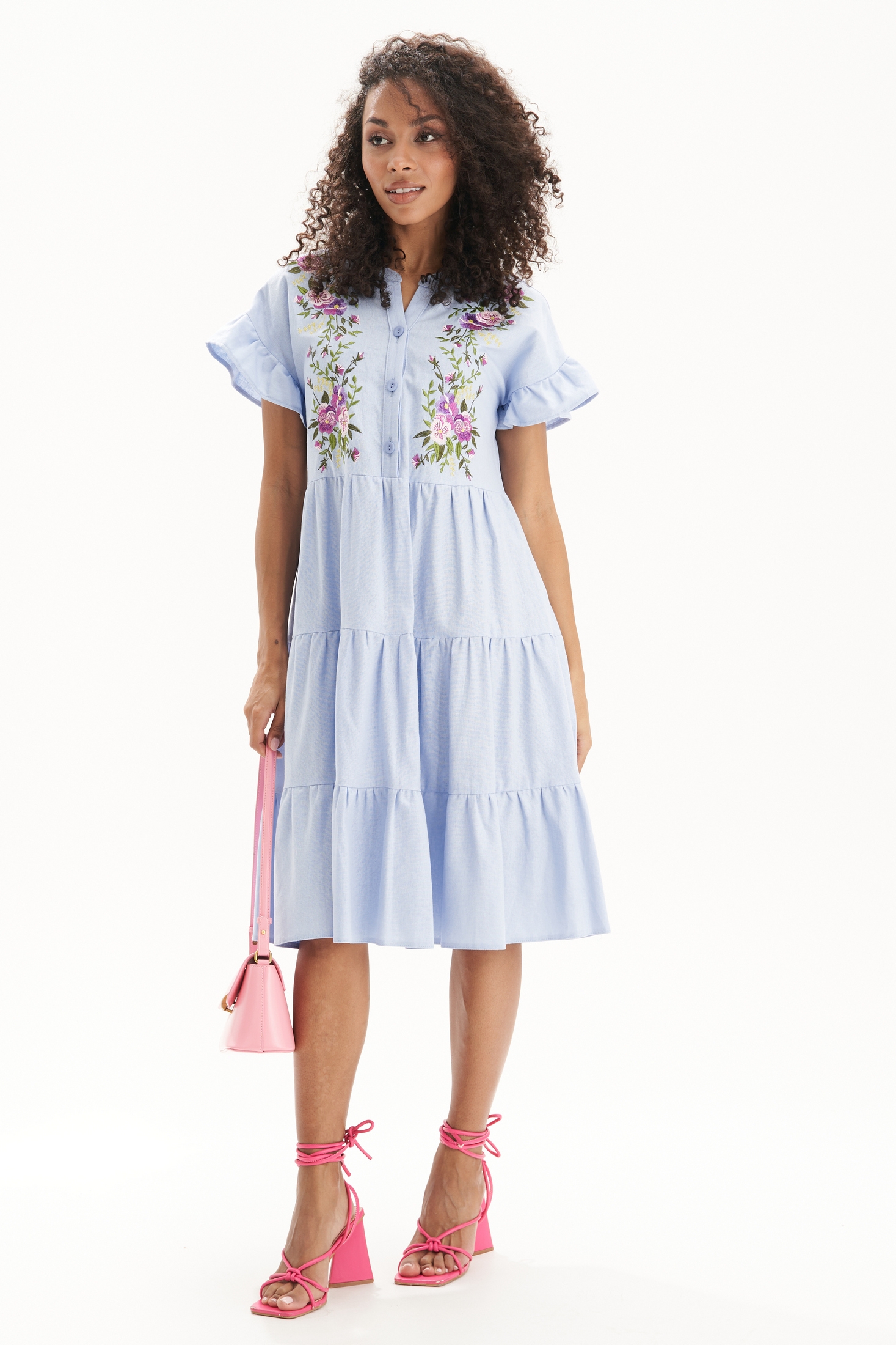 Платье женское с декоративной симметричной вышивкой по полочкам, длиной за колено, трапециевидного свободного силуэта, отрезное по линии талии, со спущенными цельнокроеными рукавами.