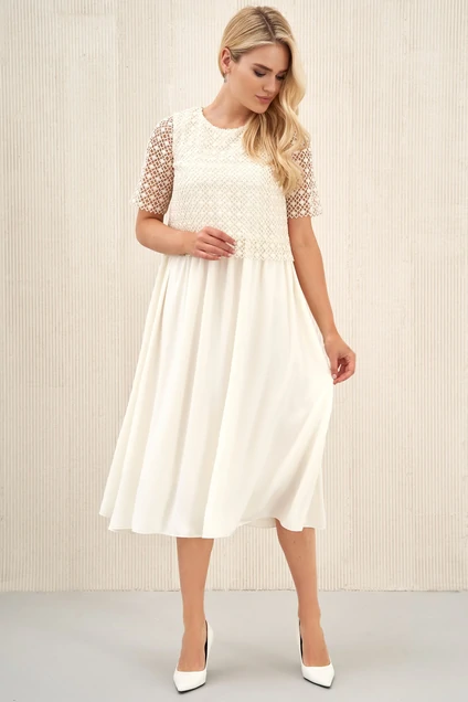 Светлое летнее платья с ажурным гипюром – это всегда восхитительные и женственные образы, позволяющие выглядеть роскошно и привлекательно. Платье женское комбинированное, длиной миди, прямого силуэта, отрезное по линии талии, лиф отлетной. Перед платья с нагрудными вытачками, выходящей из бокового шва. Спинка без среднего шва с застежкой на одну петлю и пуговицу. Горловина круглой формы, обтачная. Нижняя часть платья со сборкой по линии талии. Рукава втачные одношовные, длиной 3/4 Длина платья по середине спинки – 117,0 см (±3,0 см), длина рукава – 32,0 см (±1,0 см) Тип ткани: костюмно-плательная.