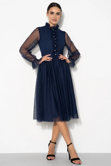 В этом великолепном платье вы будете чувствовать себя уверенно и стильно, обращая на себя восхищенные взгляды окружающих. Элегантный дизайн платья делает его отличным выбором для вечернего мероприятия или особого случая. Платье женское многослойное, силуэта песочные часы, отрезное по линии талии, длиной миди. Верхний слой платья из отделочного материала - сетка, нижний слой - легкая плательная ткань. Верхняя часть переда (лиф) с рельефами, выходящими из проймы и идущими до линии талии. По центру переда настрочена рюша с пришитыми на ней декоративными пуговицами. Спинка (лиф) с талиевыми вытачками. Нижняя часть платья (юбка) многослойная, расклешенная книзу. Верхний слой юбки состоит из двух слоев сетки. В шве притачивания юбки к лифу - сборка. Спинка платья со средним швом, в котором обработана застежка на потайную тесьму-молнию. Рукава втачные одношовные, длинные со сборкой по окату и резинкой и рюшей по низу. Горловина круглой формы обтачная, с рюшей.  Прекрасно сочетается с жакетом  22-774-2 Длина платья по среднему шву спинки до талии - 38,0 см (±1,0 см), Длина платья по среднему шву спинки до низа - 112,0 см (±3,0 см), Длина рукава платья - 70,0 см (±1,0 см) (плательно-блузочная)