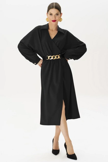 Платье женское со спущенным цельнокроенным рукавом типа “летучая мышь” “на запАх” и резинкой по линии талии. По низу рукава идет сборка и манжет, который застегивается на петлю и пуговицу (фурнитура может незначительно отличаться от фото). Спинка платья со средним швом. Горловина V-образная с отложным воротником, концы воротника острые.
