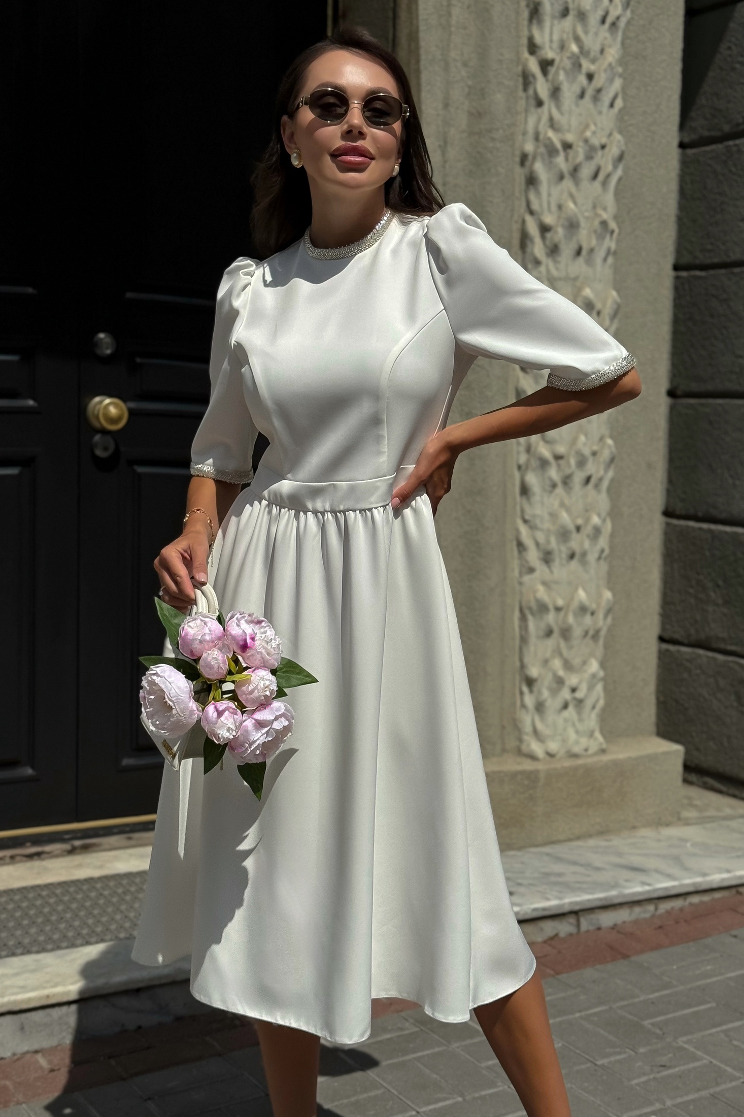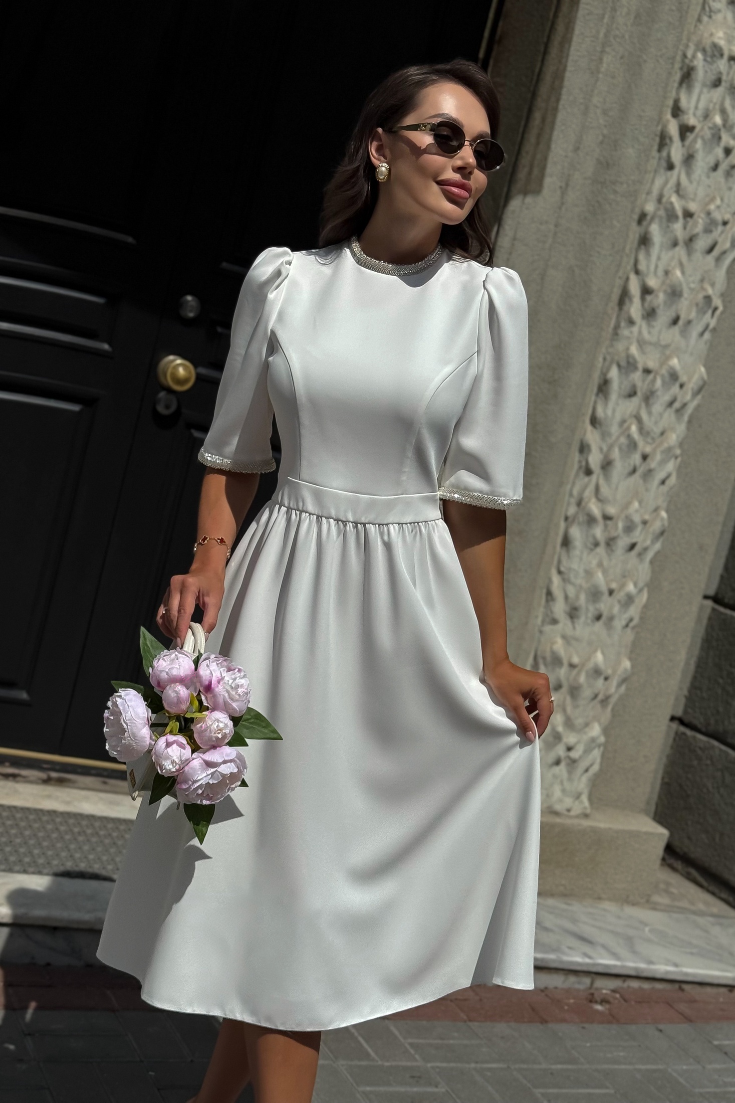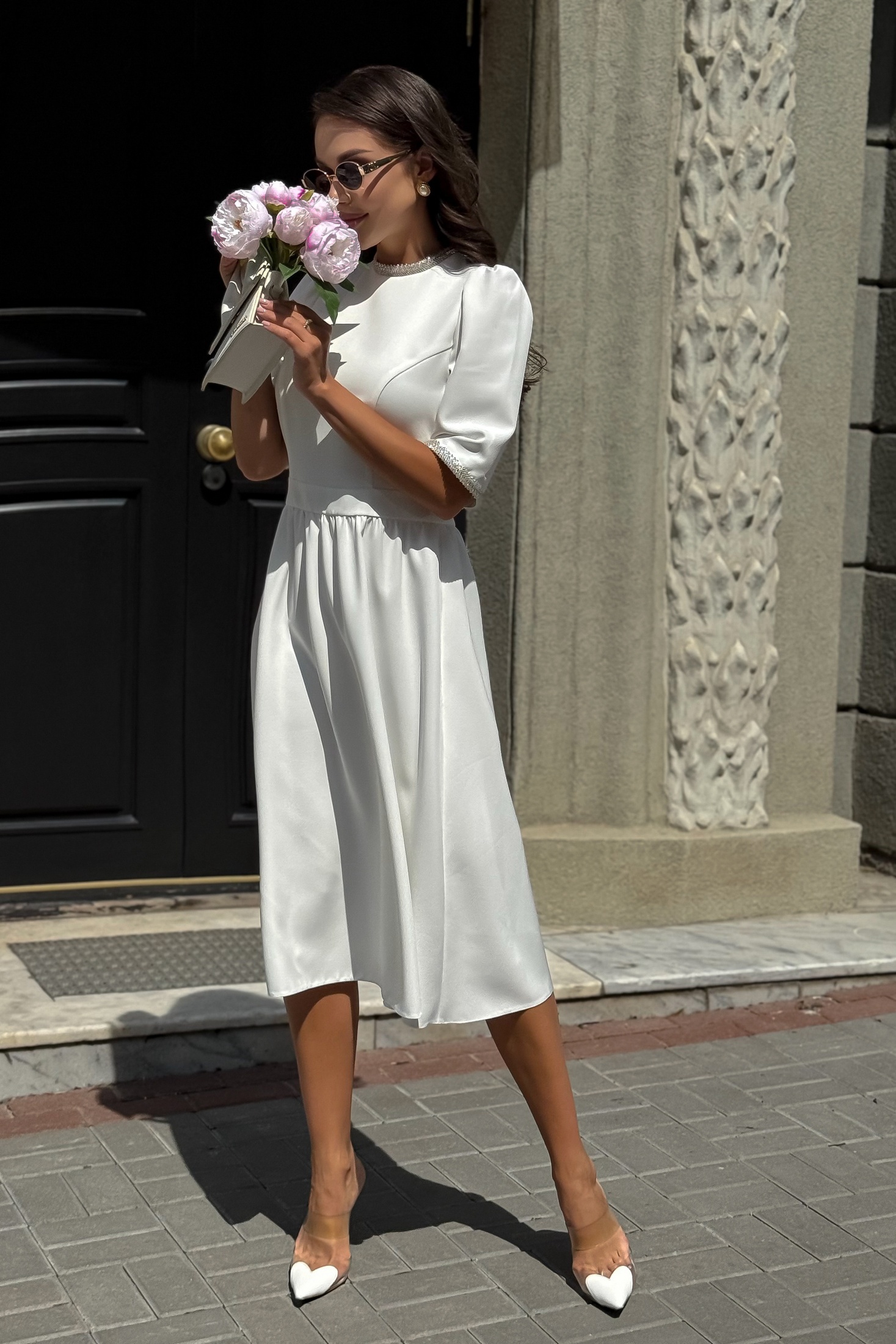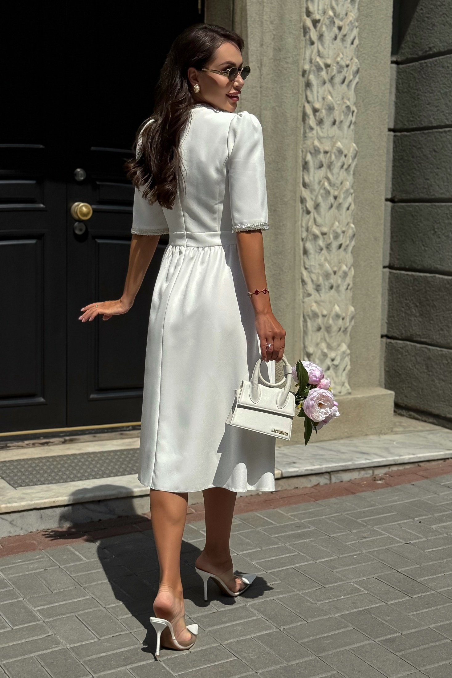 Белое элегантное платье — универсальная модель для повседневной элегантности и особых случаев. Полуприлегающий силуэт с отрезной талией подчёркивает фигуру, аккуратная сборка создаёт мягкое прилегание, а воротник-стойка и деликатная отделочная тесьма по горловине и рукавам добавляют нарядного блеска. Рельефные линии по переду и спинке визуально формируют «песочные часы», скрытая молния на спинке обеспечивает удобную посадку. Это идеальный выбор для любого праздничного мероприятия. Оно подчеркнет вашу элегантность и женственность. В этом платье вы будете звездой вечера!
