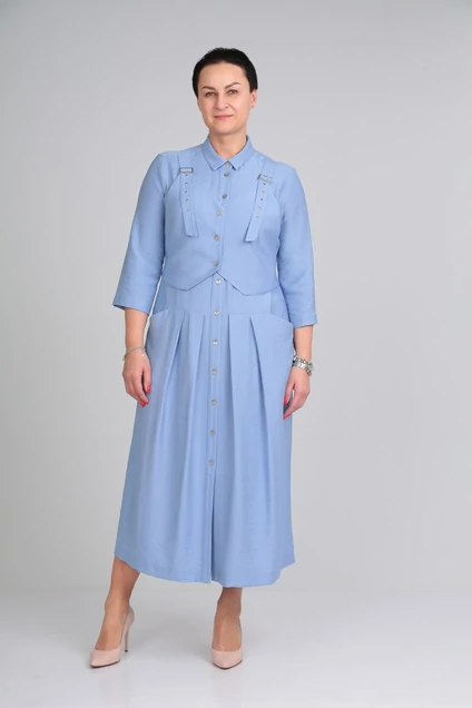 К платью предлагается сьемный жилет ,который крепится на лямках с пряжками из плечевого шва и застегиваеся аналогично по спинке.