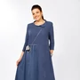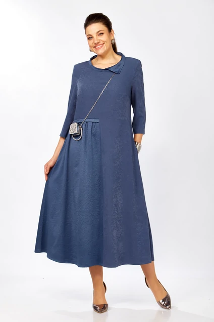 Нарядное платье полуприлегающего силуэта в иысканном дымчато-голубом оттене, отрезное по линии талии с обтачными планками. Полочки с нагрудными вытачками, которые выходят из бокового шва. Нижняя часть платья А-силуэта с одной стороны по линии талии с образованием мягких складок. Особенно выиграшно оно смотрится на фигуре, где надо прикрыть живот и бедра. Рукав втачной одношовный, длиной ¾. Вырез горловины округлой формы со стойкой и фантазийным воротником. Пошито платье из двух видов плательной ткани-бархатистой и шелковистой структуры.