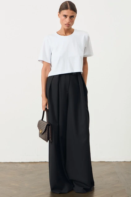 Элегантные черные брюки свободного кроя - идеальный выбор для создания стильного образа. Модель выполнена из качественного материала, обеспечивая комфорт и легкость при носке. Брюки дополнены удобными боковыми карманами и широкими складками, которые добавляют объем и динамику. Широкие к низу штанины гармонично дополняют общий силуэт, создавая изящную и современную линию. Эта модель на поясе подчеркнет вашу фигуру и добавит утонченности в каждый наряд.