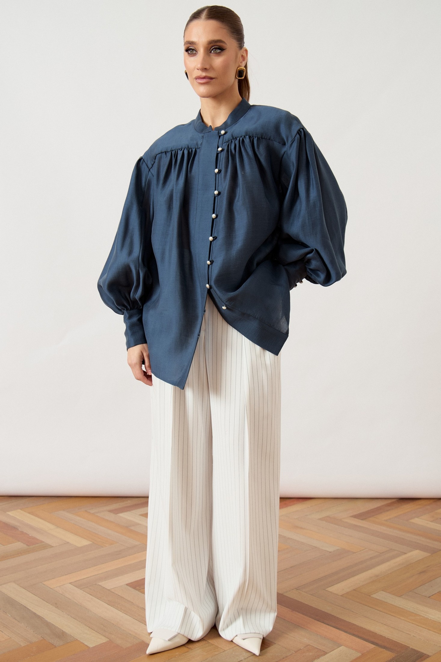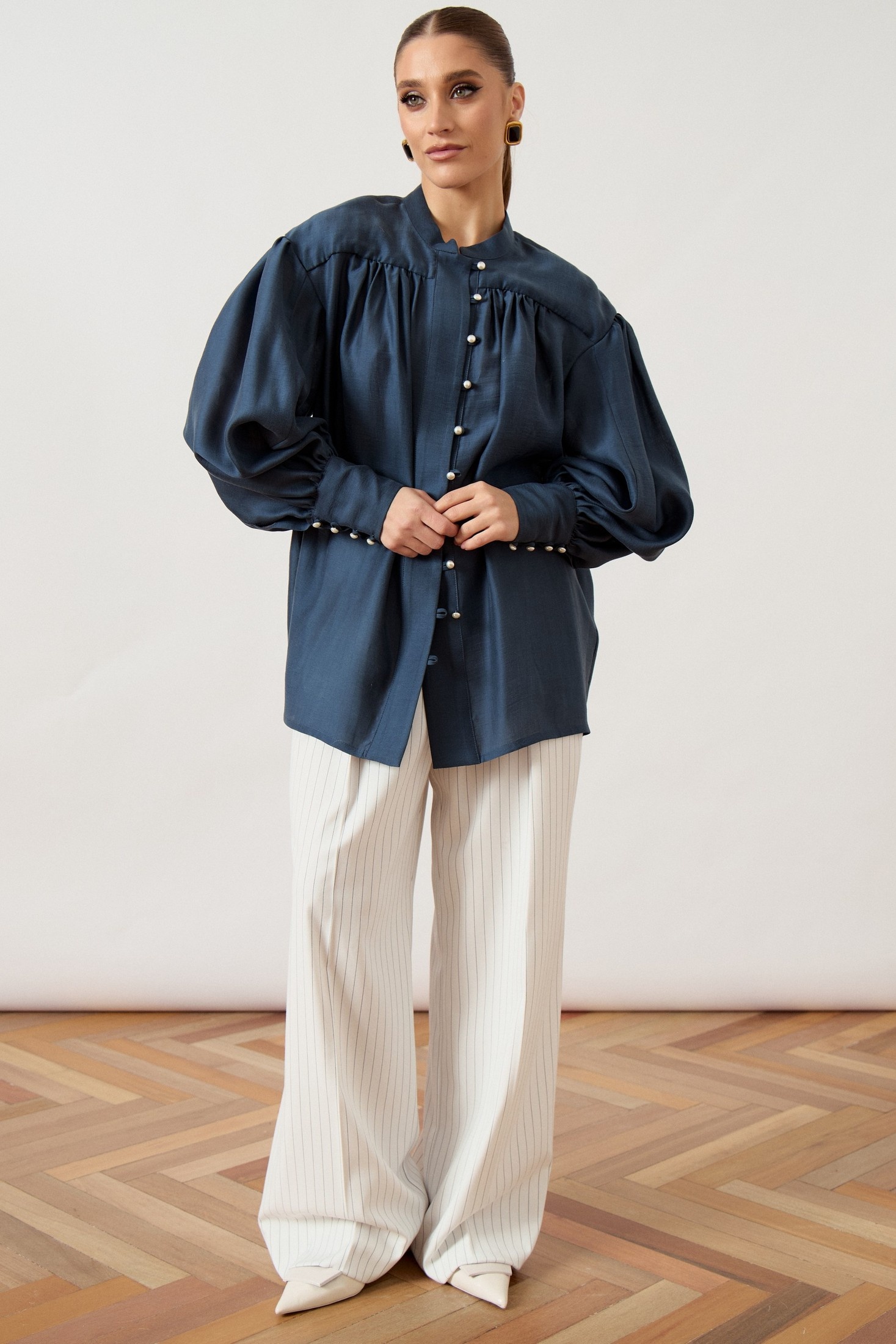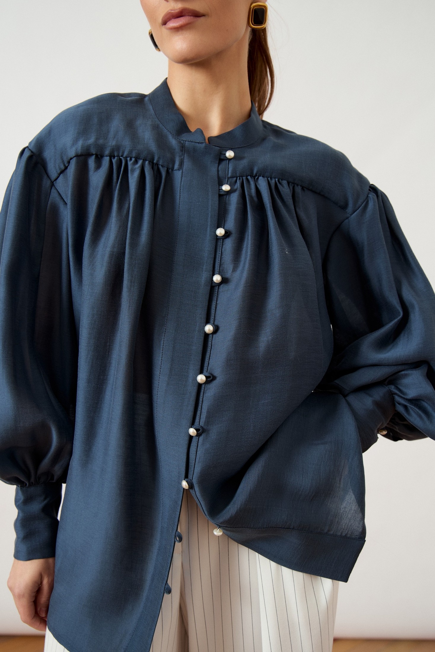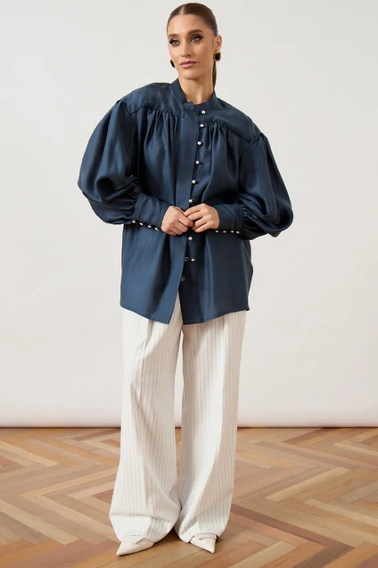 Рубашка 3502-1 ATTIKA — это воплощение стиля и комфорта. Коллекция бренда ATTIKA предлагает блузу свободного силуэта с воротником-стойкой и жемчужными пуговицами. Сделанная из легкой плательной ткани с добавлением вискозы и эластана, она обеспечивает свободу движений и элегантный вид. Объемные епископские рукава с манжетой добавляют уникальности, а глубокая густая сборка по линии груди и спинки создает летящий силуэт. Универсальная модель для весны и осени в стильном темно-синем оттенке, она прекрасно дополнит как офисный, так и повседневный гардероб. Длина изделия по спинке средней длины, что подходит для сочетания с брюками и юбками.