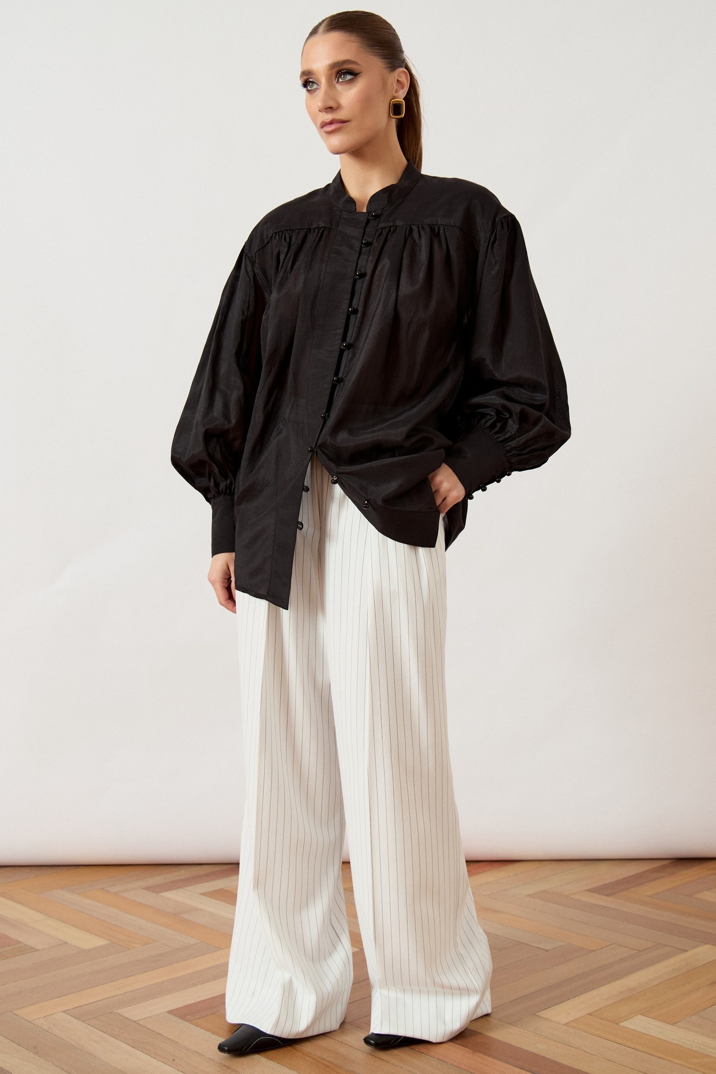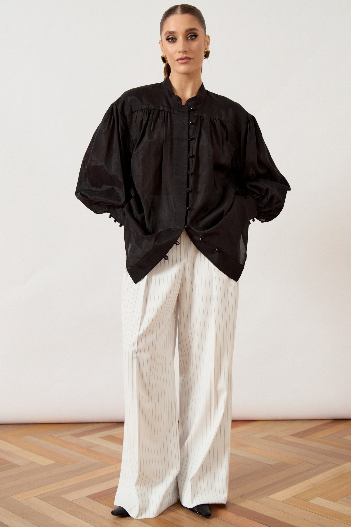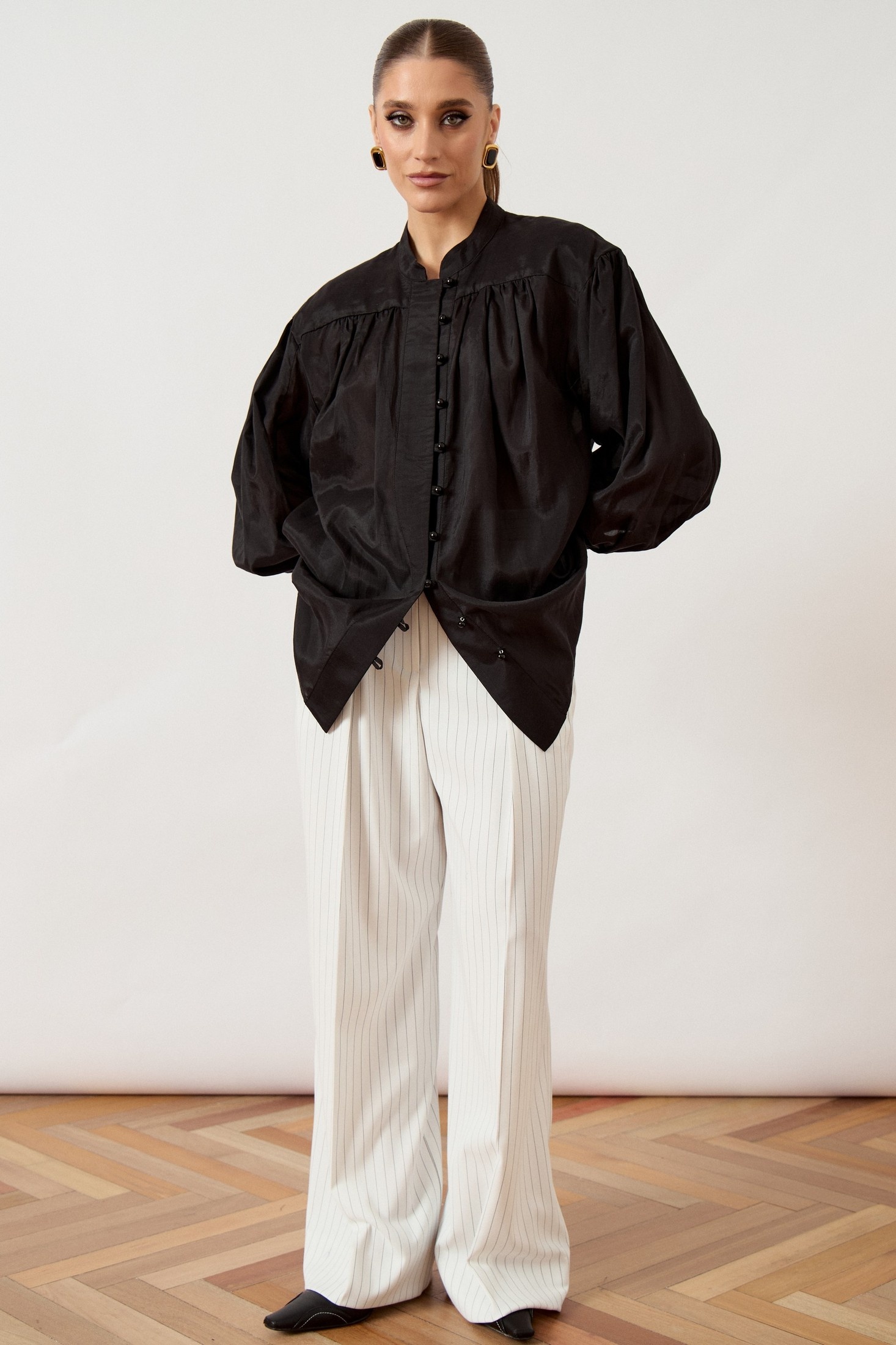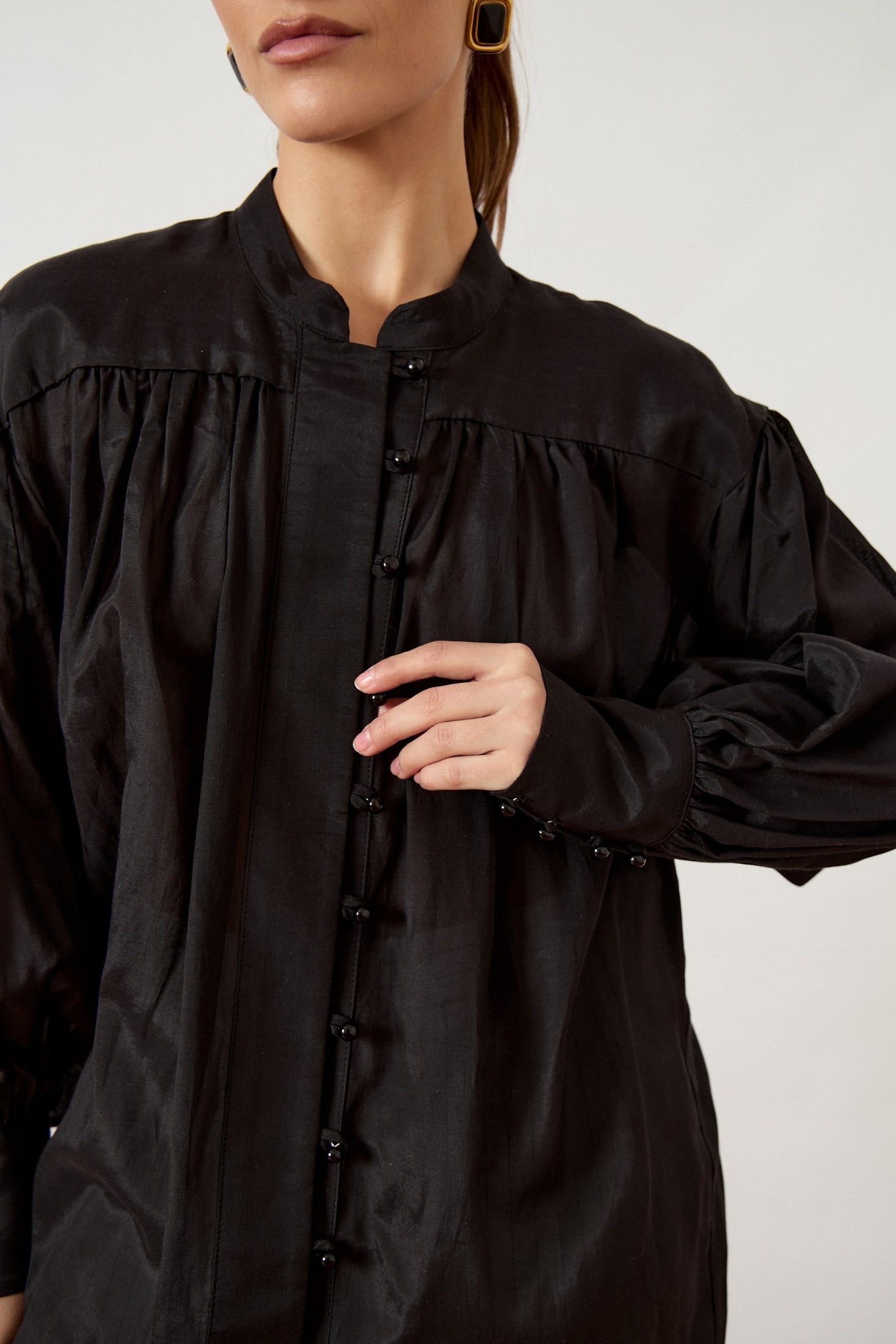 Рубашка 3502 ATTIKA бренда Attika сочетает в себе стиль и комфорт. Коллекция бренда Attika выполнена из струящейся плательной ткани, которая состоит из полиэстера, вискозы и эластана, обеспечивая приятное прилегание и легкость материала. Модель с воротником-стойкой и жемчужными пуговицами добавляет утонченности. Объёмный оверсайз фасон с глубокими сборками по линии груди и спинки подходит для создания свободного, летящего силуэта. Втачные рукава формы «епископ» с притачной манжетой акцентируют внимание на вашем уникальном стиле. Универсальная модель черного цвета подходит для модных повседневных образов в осенний и весенний сезоны.