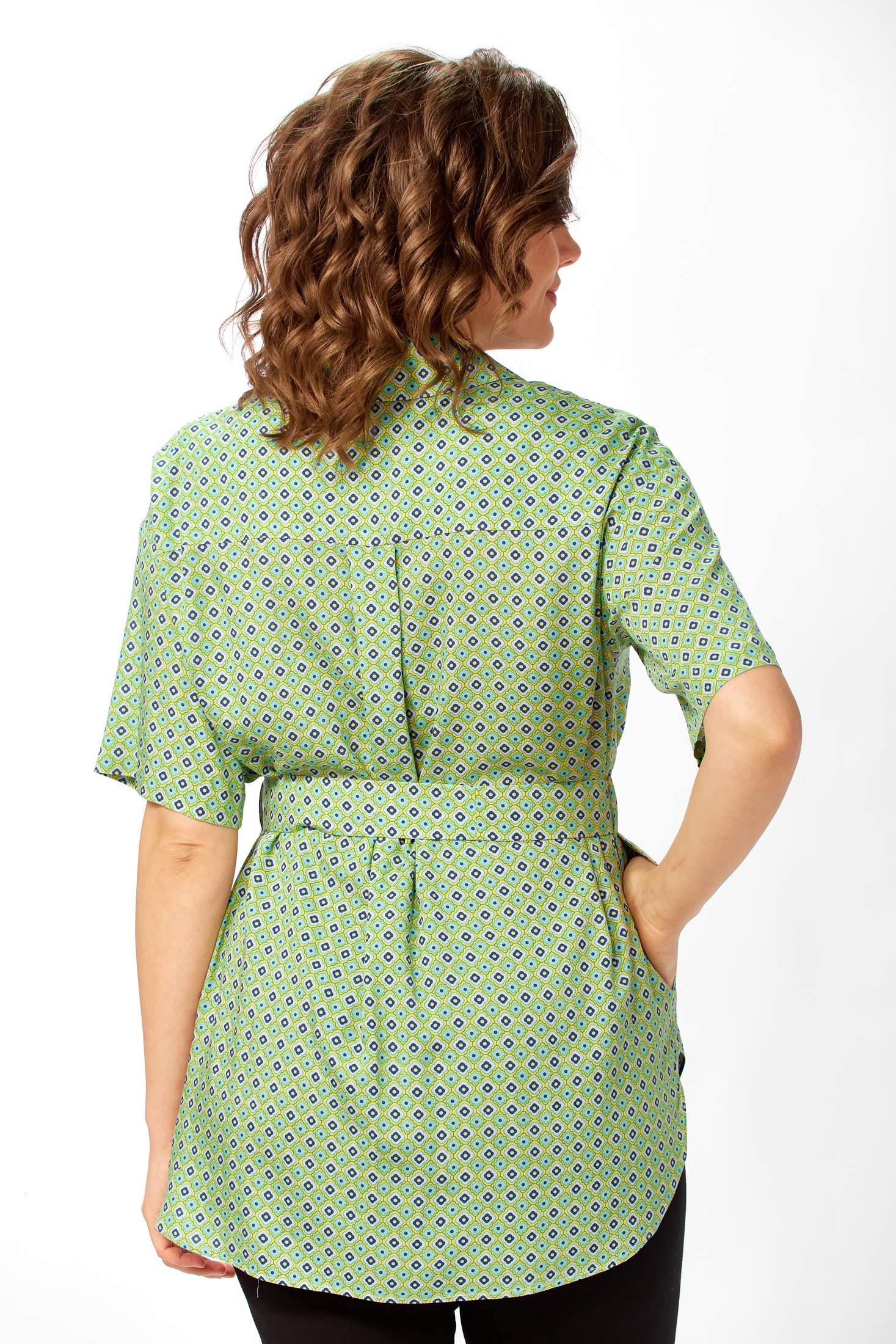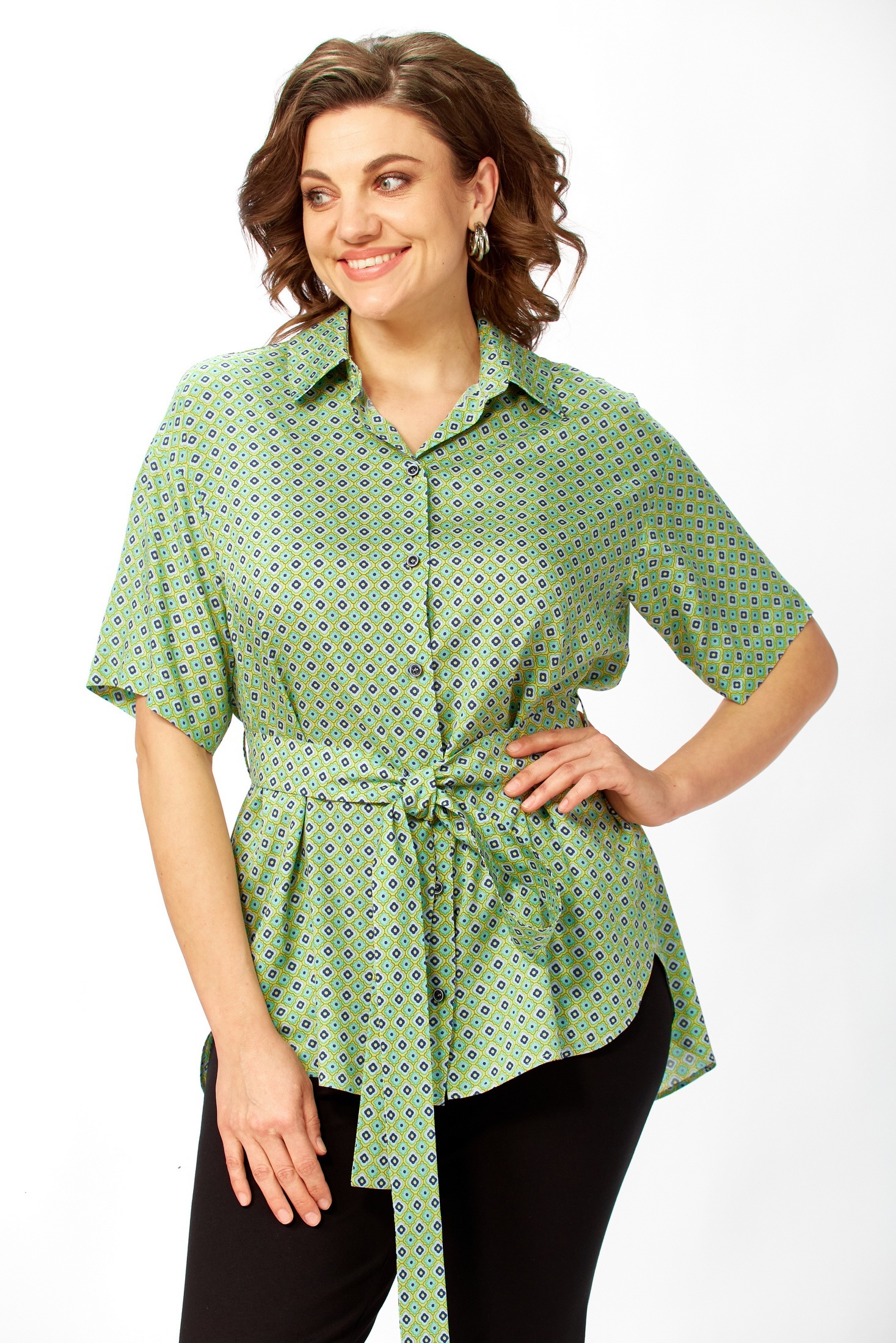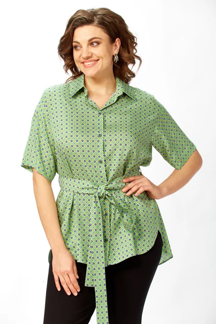 Рубашка 0354 AVENUE — стильный выбор для современной женщины. Коллекция бренда AVENUE предлагает свободный фасон, который обеспечивает комфорт и свободу движений. Изготовлена из 100% вискозы, материал которой легкий и приятный на ощупь. Рубашка имеет закругленные края и чуть удлиненную спинку, что добавляет изящества к вашему образу. Практичный и удобный дизайн с карманами в боковых швах и короткими рукавами. Яркий геометрический рисунок станет акцентом любого наряда, а зеленый цвет подчеркнет вашу индивидуальность. Идеально подходит для весенне-летнего сезона и повседневных выходов. Длина изделия по спинке составляет 79 см, длина рукава — 21 см, что делает его универсальным выбором для любого случая.