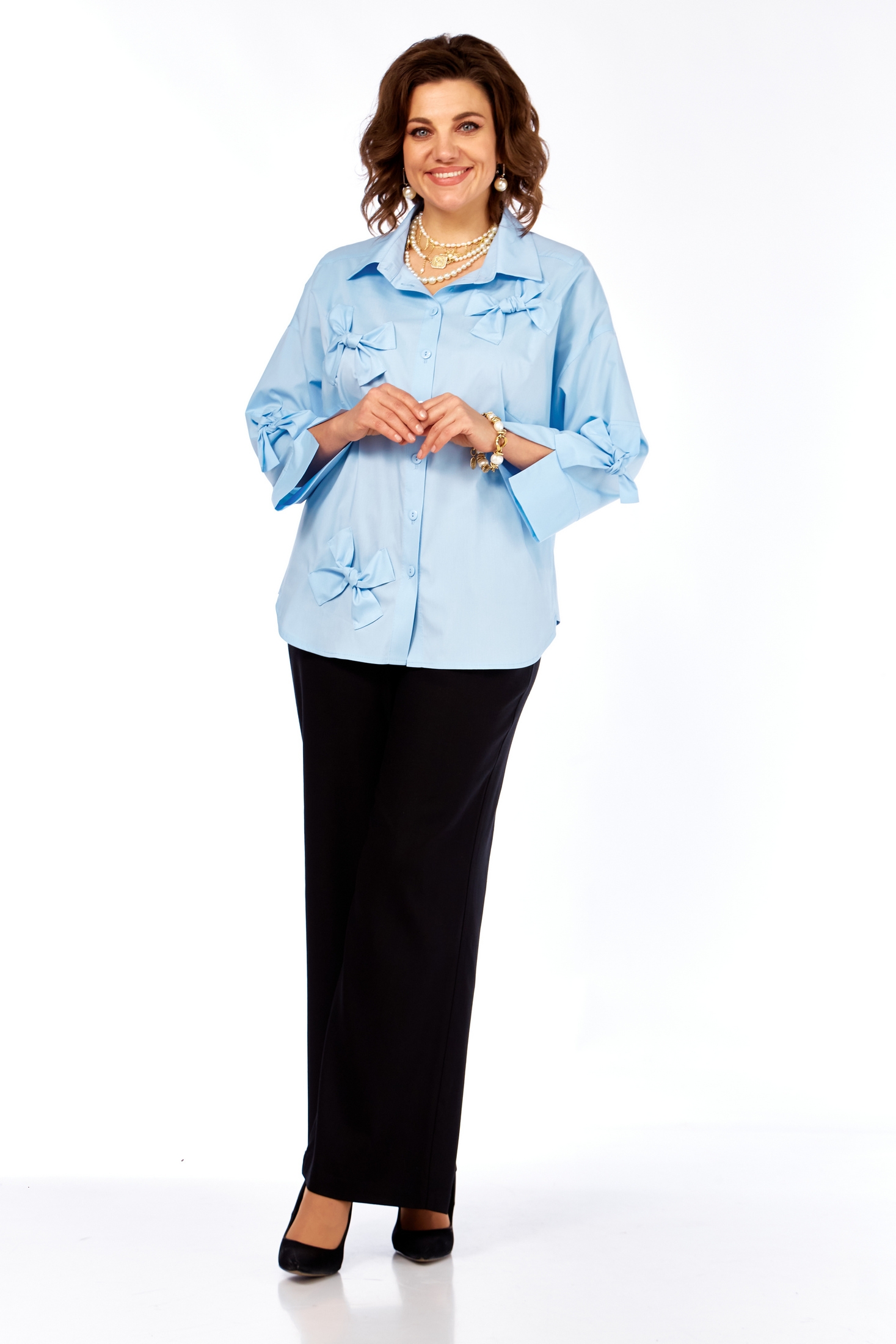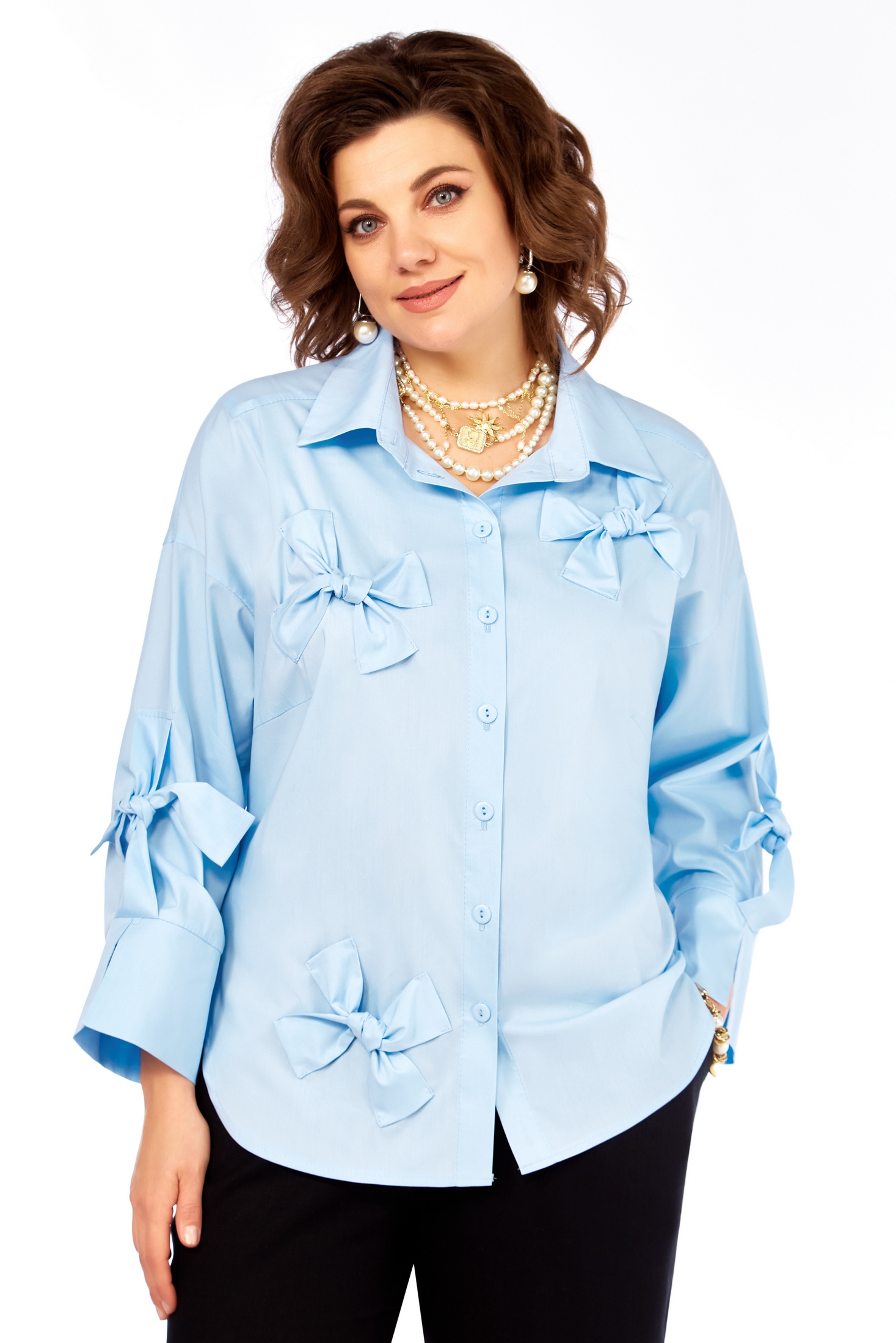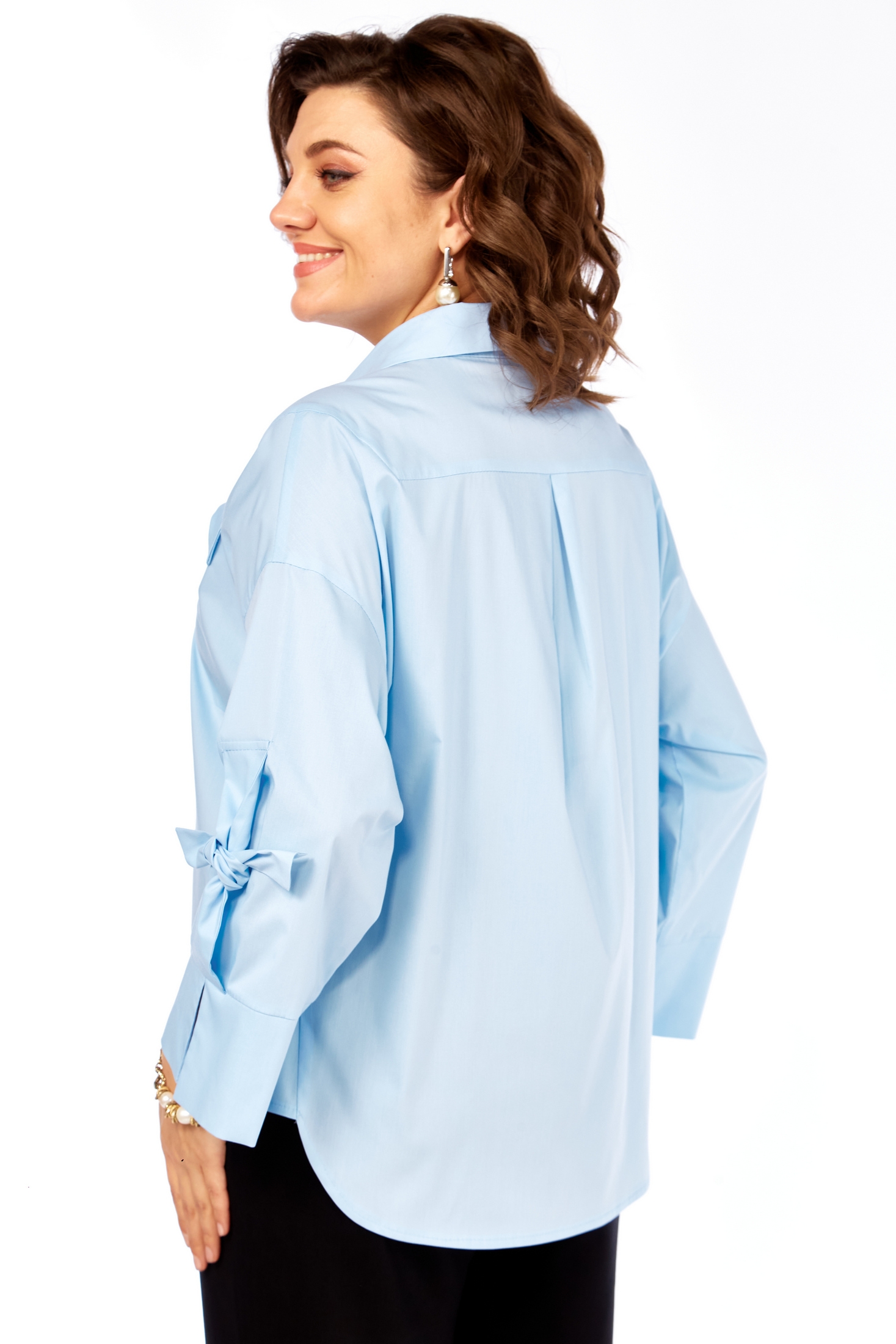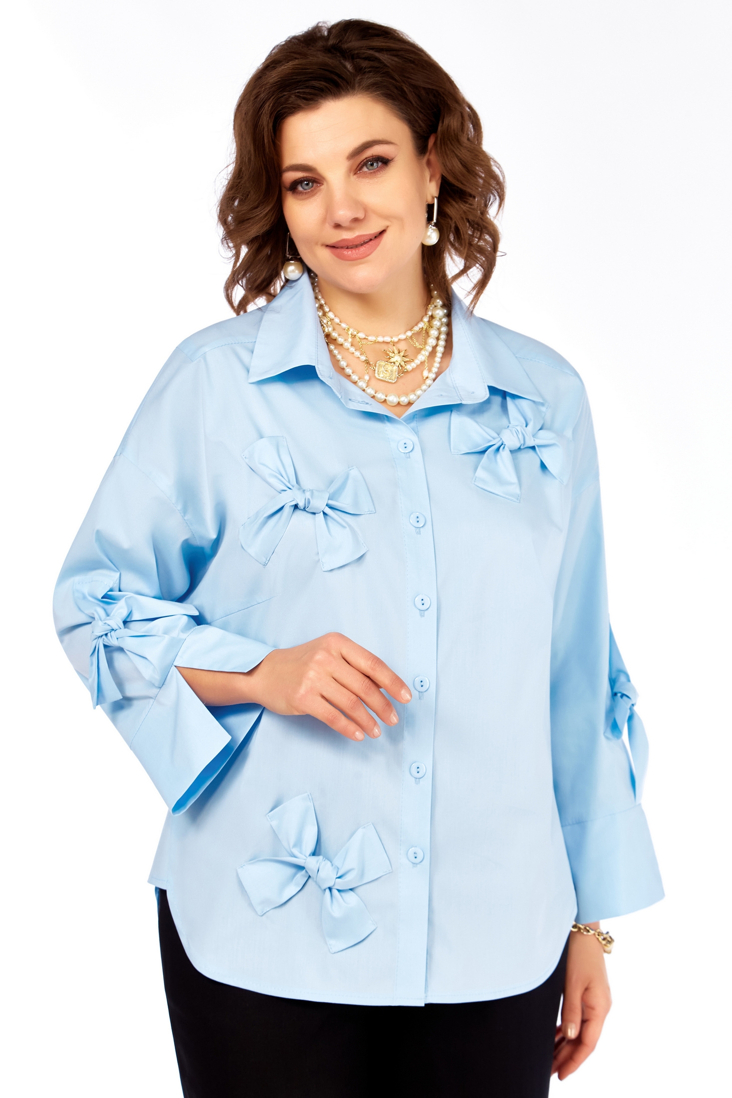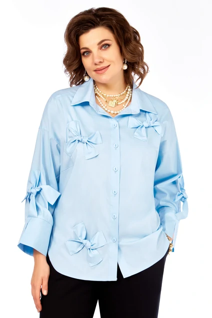 Рубашка женская, со спущенным плечом, центральной бортовой застежкой на петли и пуговицы. Перед с нагрудными вытачками, идущими от центра груди к боковым швам. По переду расположены декоративные бантики. Спинка с кокеткой, переходящей на перед. От кокетки идет встречная складка. Воротник рубашечный с отрезной стойкой. Рукав длиной 3\4, с отрезной манжетой (в манжете есть разрез). Рукав с патами, завязывающимися на бант. В боковых швах расположены втачные клинья. Низ рубашки закругленный.