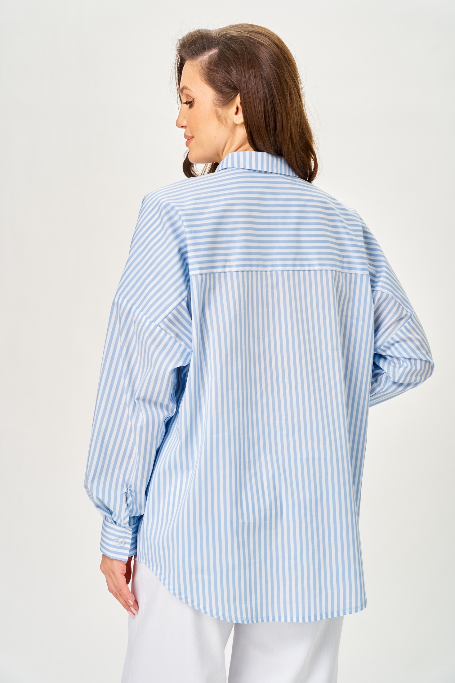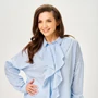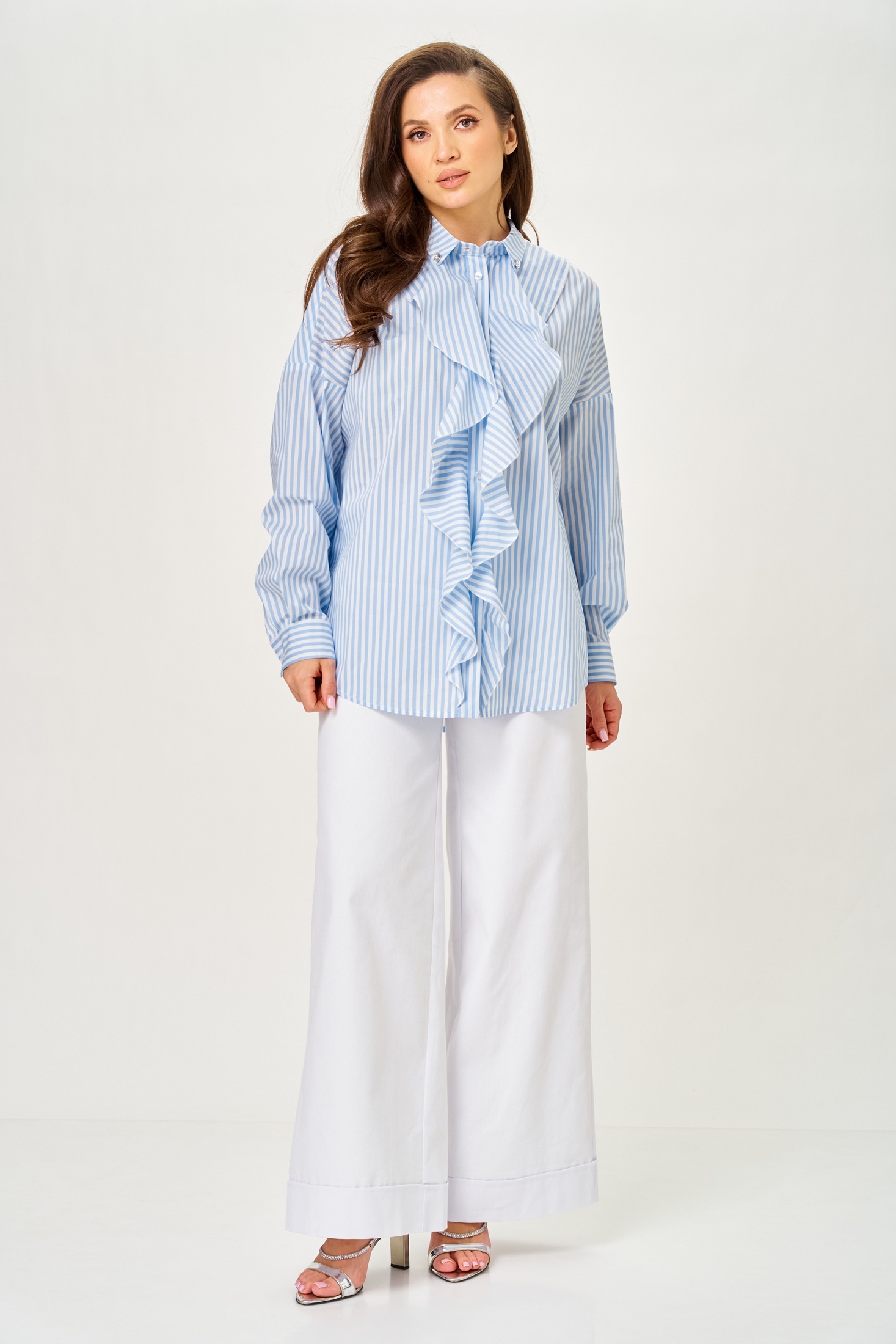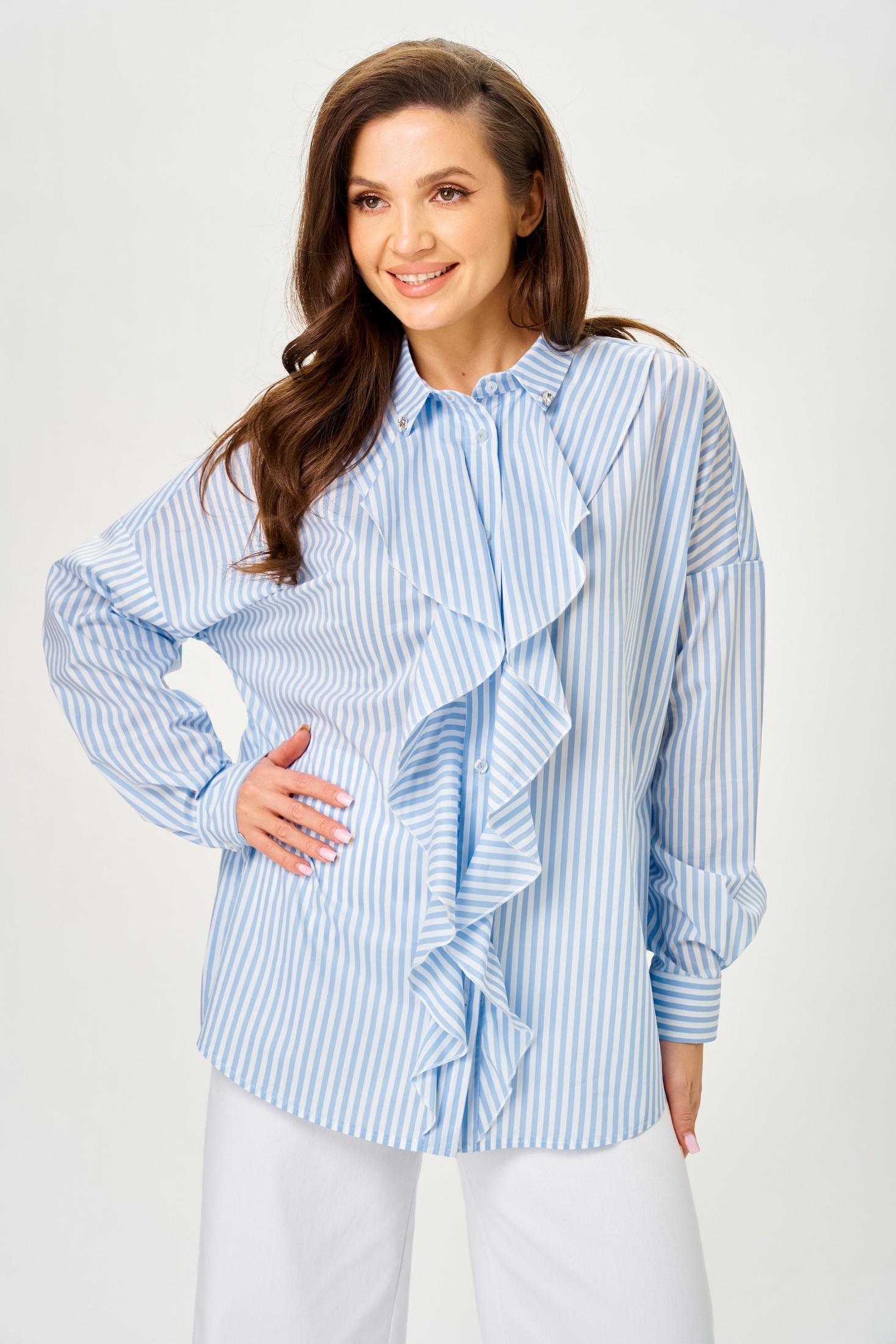 Рубашка 799 Michel Chic — идеальное дополнение для вашего гардероба. Коллекция бренда Michel Chic создаёт свежий образ с небесно-голубой полоской в цвете 'Морской бриз'. Модель выполнена из рубашечной ткани с добавлением хлопка, нейлона и спандекса, что обеспечивает долговечность и сохраняет форму в течение дня. Свободный крой и архитектурный волан придают лёгкость и женственность, а стразы на воротнике добавляют деликатное мерцание. Длинные рукава с манжетами на пуговицах подходят для любого сезона, идеально сочетаясь с брюками, джинсами и юбками. Рубашка подходит на рост 170 см и легко создаёт аккуратный и современный силуэт.