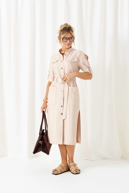 Сарафан 6460 бежевый Beautiful&Free добавит лёгкости и комфорта в ваш гардероб. Коллекция бренда Beautiful&Free создана для тех, кто ценит стиль и удобство. Платье из льна и вискозы, что обеспечивает мягкость и лёгкость в носке. Полуприлегающий силуэт и длина миди делают его идеальным выбором для летнего сезона. Акцентные детали включают накладные карманы и пояс на декоративной пряжке-полукольцо. Застёжка на пуговицы добавляет практичности образу. Рукава длиной 33 см и разрезы по бокам придают современный вид и обеспечивают комфорт. Воротник-стойка и ровный низ делают этот сарафан идеальным для повседневного и офисного стиля. Бежевый цвет легко комбинируется с другими элементами вашего гардероба.