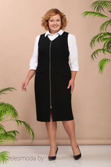 Элегантный женский комплект состоит из сарафана и блузки. Сарафан полуприлегающего силуэта, отрезной по линии талии, по переду центральная застежка на молнию, на уровне бедер накладные карманы с клапаном. Горловина образная. Спинка с центральным швом и талиевыми вытачками. Сарафан на подкладке. Блуза полуприлегающего силуэта с центральной застежкой на петли – пуговицы, по переду отрезные кокетки, на уровне талии по боковой части переда отделочные защипы, воротник рубашечного типа. Рукава втачные со сборкой по окату. Низ рукава оформлен манжетом. Длина сарафана по спинке 105 см Длина блузы по спинке 63.5 см Длина рукава 45 см