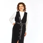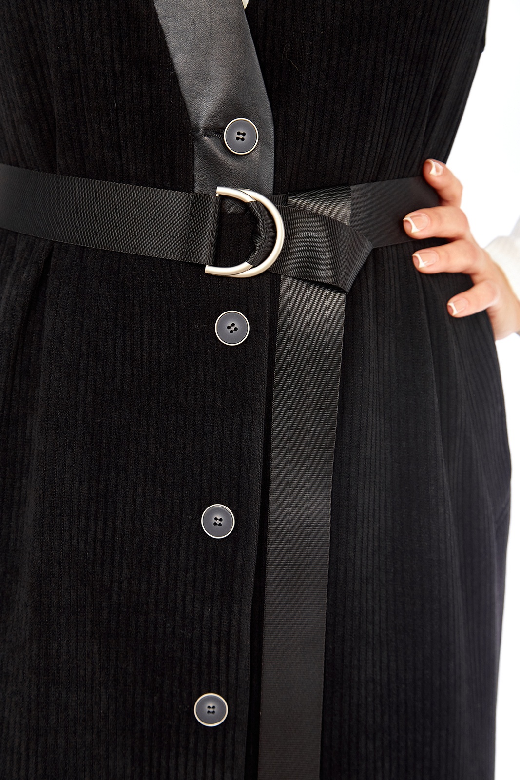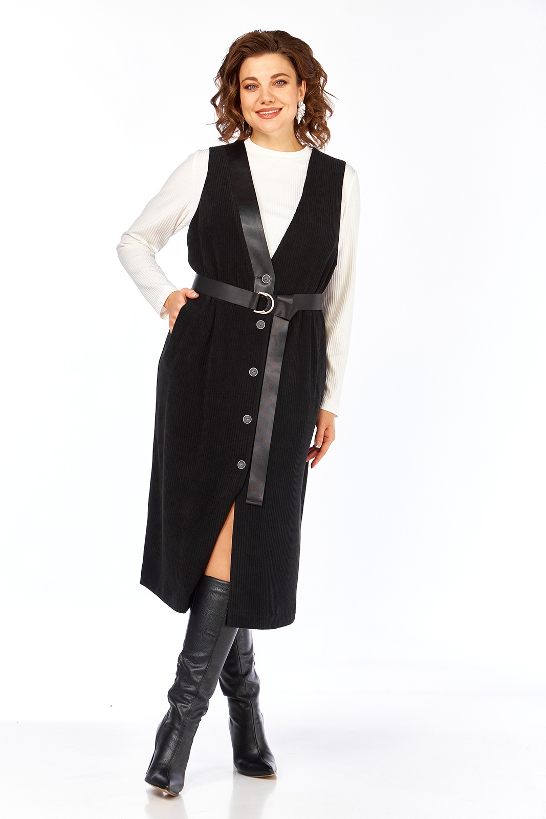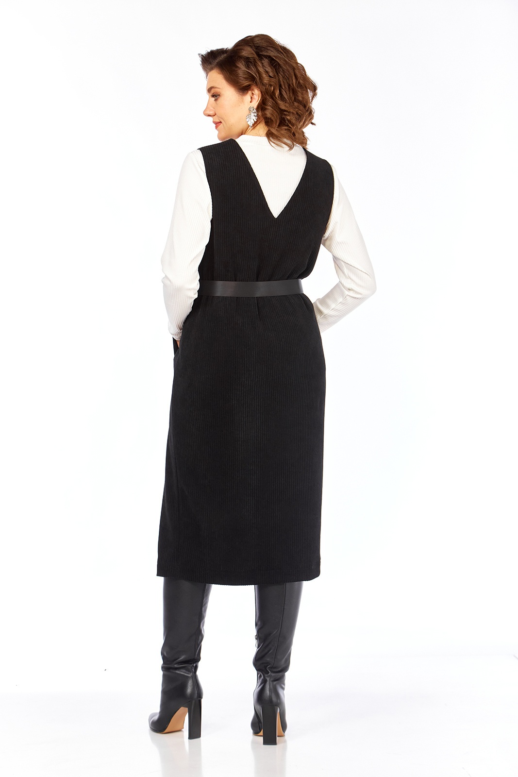 Комплект женский двухпредметный, состоит из джемпера и сарафана. Сарафан прямого силуэта из трикотажного полотна с имитацией вельвета. Горловина V -образной формы с отделкой из экокожи. Застежка центрально — бортовая на петли и пуговицы. По переду нагрудные вытачки и обработаны карманы с листочками. На спинке фигурный вырез. Сарафан на подкладке. Джемпер полуприлегающего силуэта, выполнен из трикотажного полотна. Горловина круглой формы. Рукава втачные, длинные. В комплекте съемный ремень.