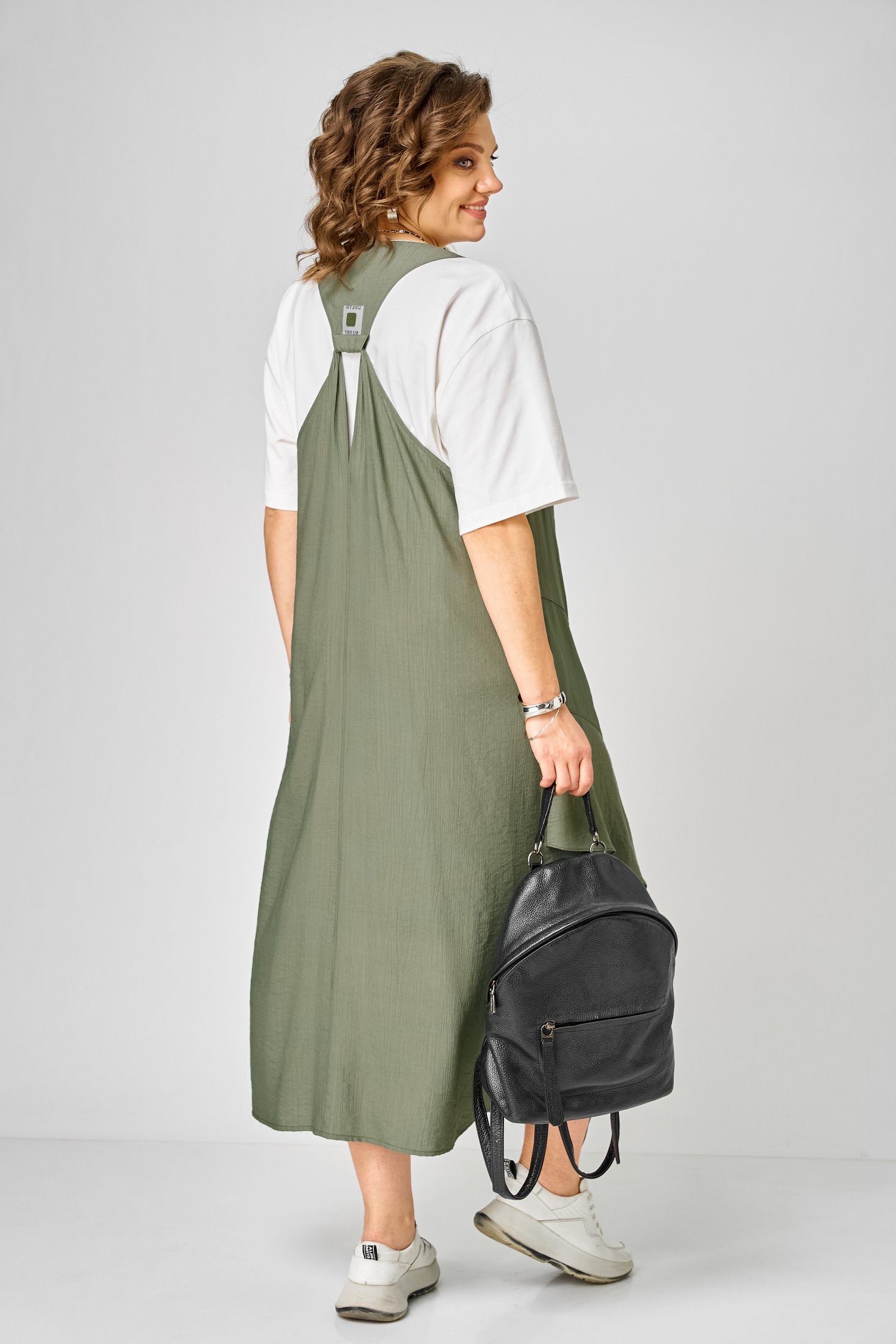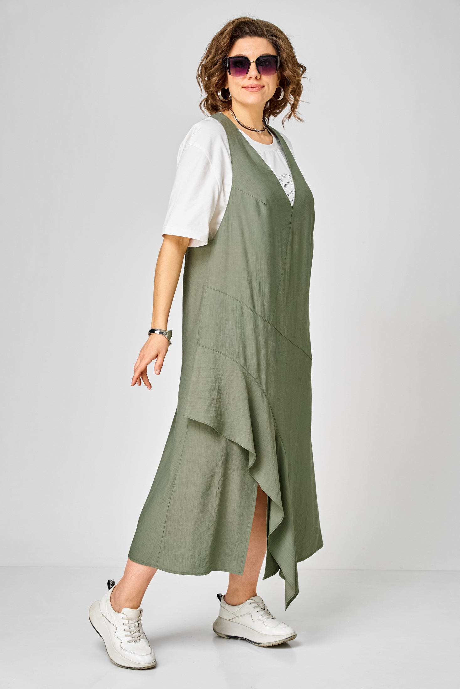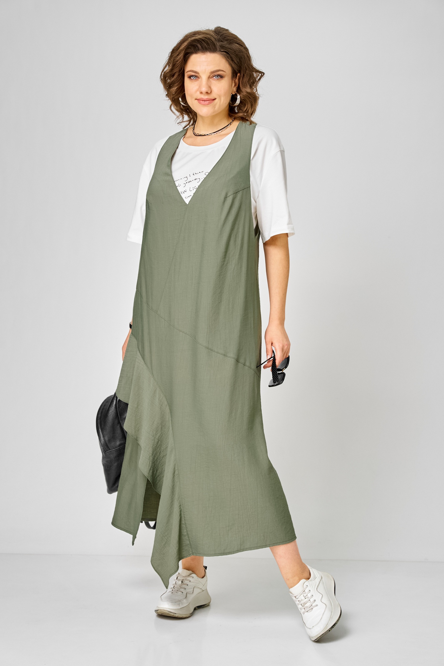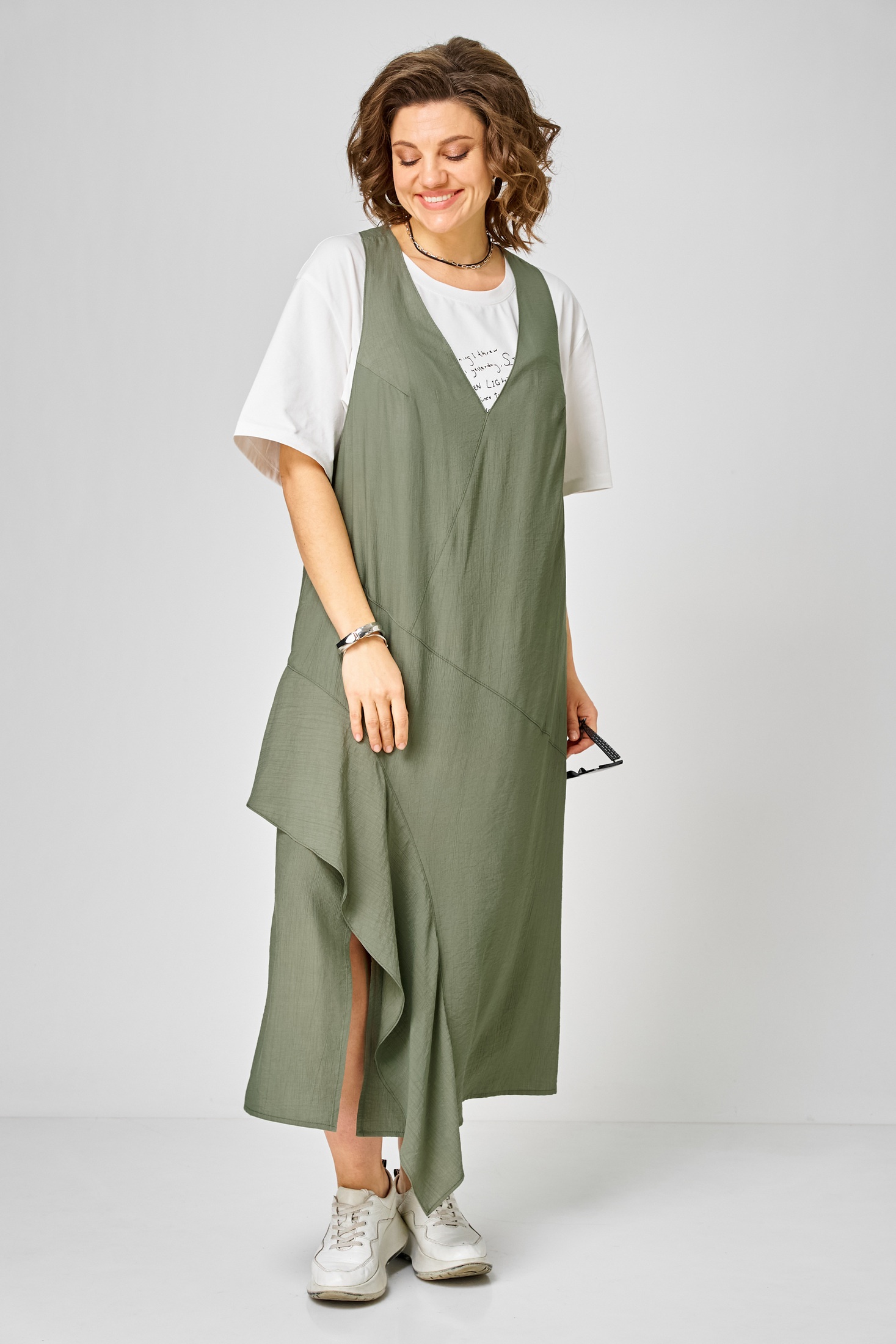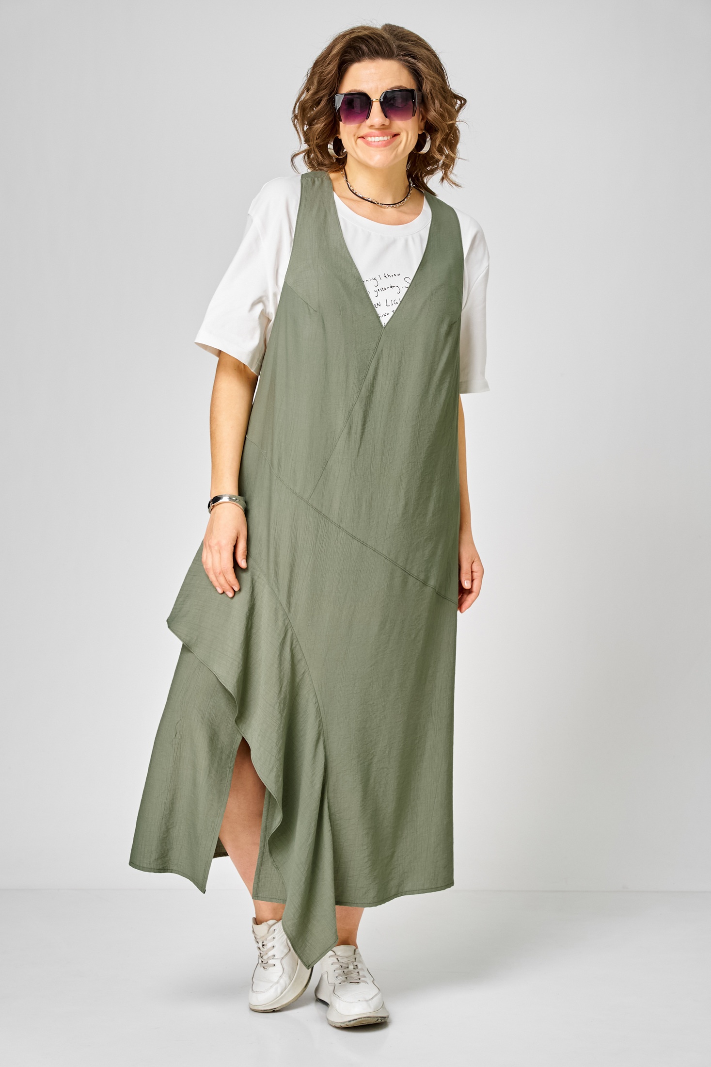 Сарафан 1437 молочный + зеленый Karina Delux — это стильный комплект, состоящий из сарафана и футболки. Коллекция бренда Karina Delux предлагает вам насладиться комфортом и стилем. Сарафан выполнен из вискозной ткани с лёгкой шелковистой текстурой и эффектом "креша", что придаёт изделию дополнительный шарм. Свободный силуэт типа трапеция и глубокая пройма обеспечивают комфорт и свободу движения. Декоративные подрезы спереди дополняются разрезом и воланом, создавая уникальный дизайн. В верхней части спинки располагается оригинальная нашивка, подчёркивающая индивидуальность модели. В комплект входит также футболка из хлопкового трикотажного полотна с термопечатью. Цветовая гамма из молочного и зеленого оттенков идеально подойдёт для весеннего и летнего сезонов, подчёркивая ваш стильный образ.