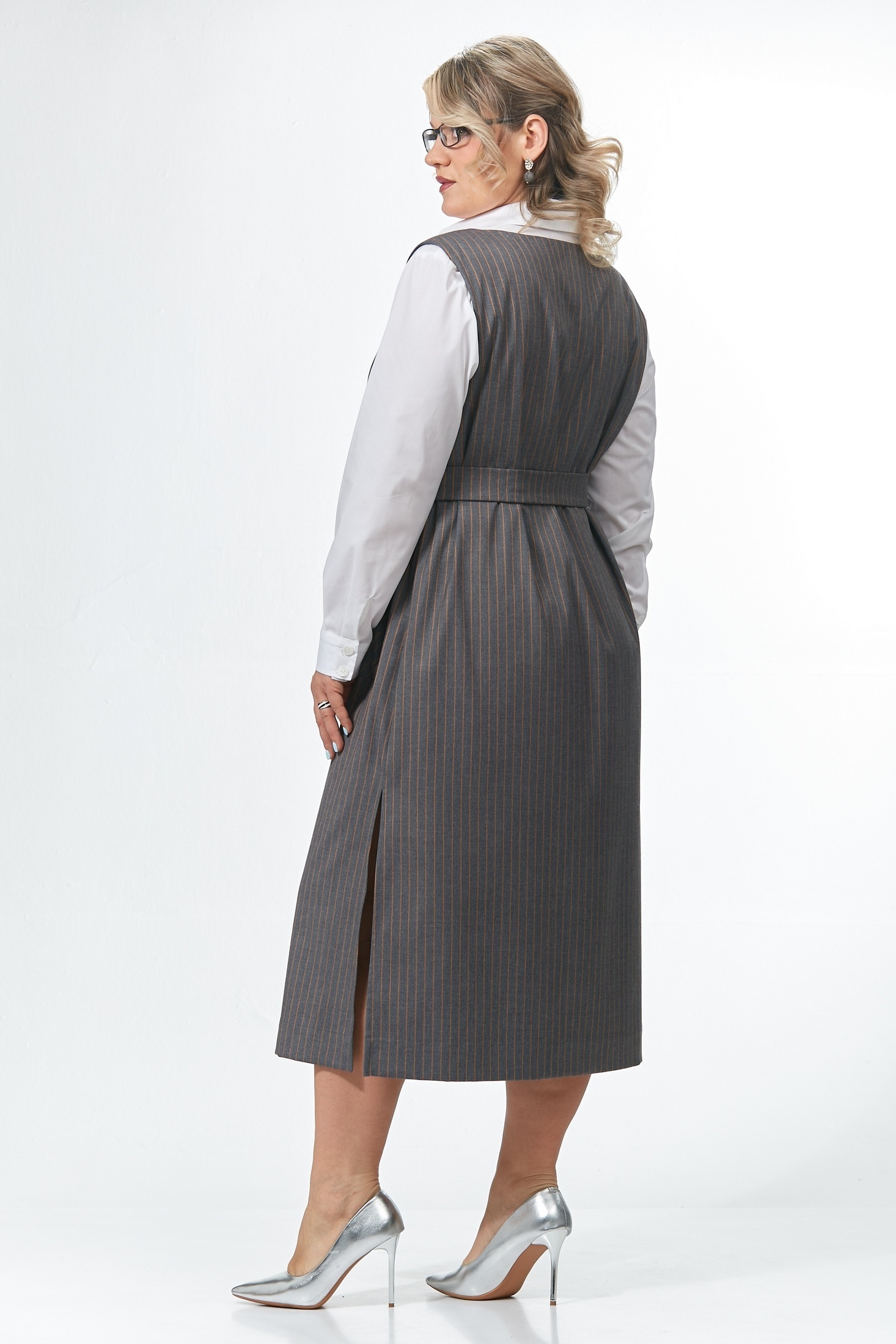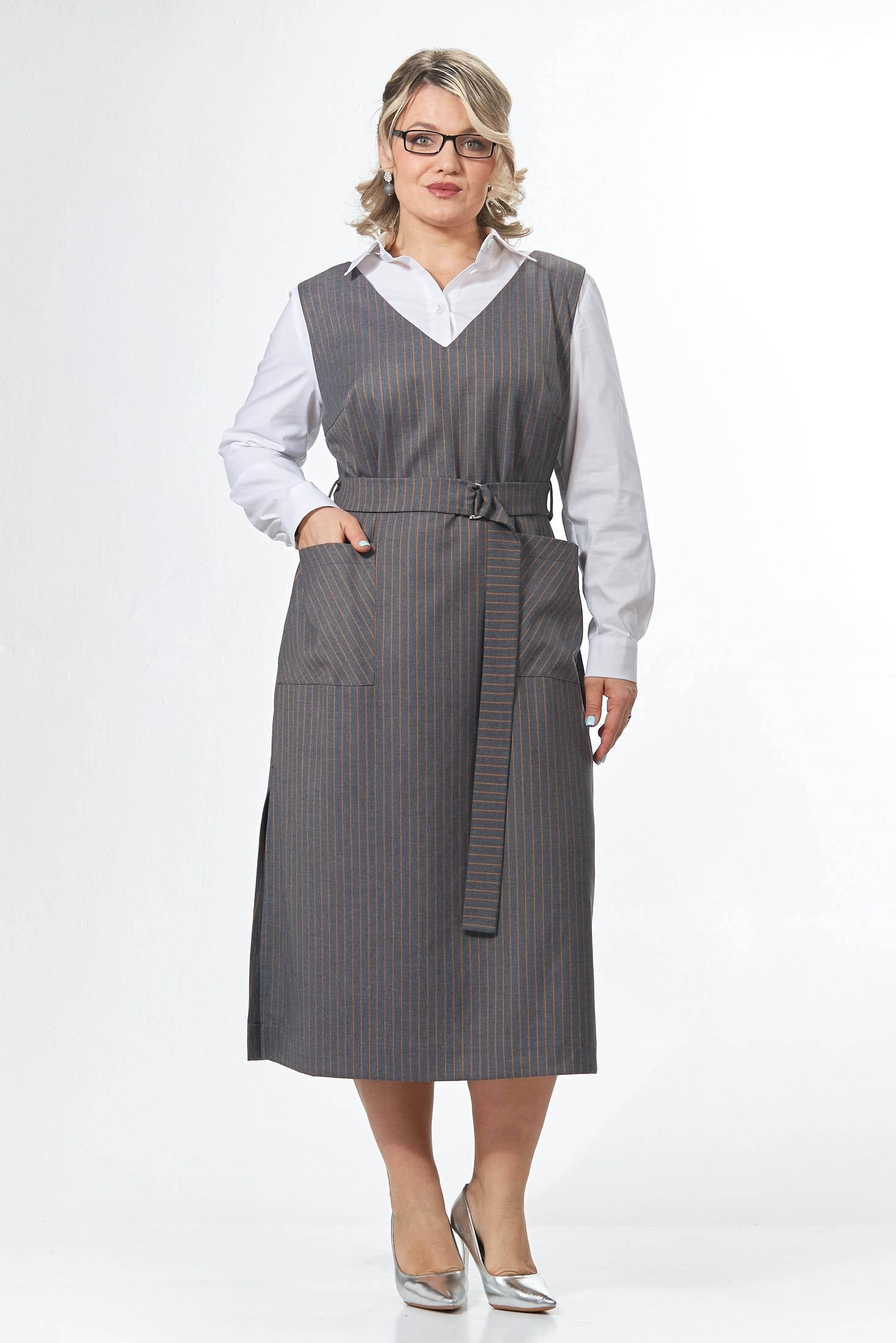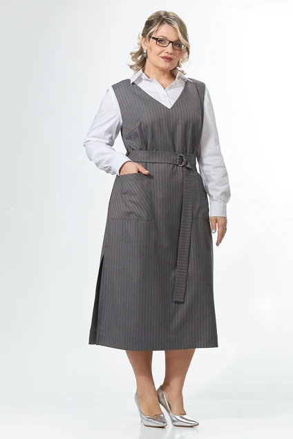 Сарафан свободного кроя мягко скрывает силуэт, даря комфорт и элегантную непринужденность. V-образная горловина подчеркивает линию ключиц, отлично сочетается с любыми блузками и водолазками. Вертикальная полоска сразу привлекает внимание, добавляя образу легкости и дерзости. Удобные накладные карманы и стильные разрезы по бокам добавляют комфорт и визуальную динамику. Функциональным дополнением к сарафану служит съемный пояс с пряжкой. Платье сшито из премиального турецкого текстиля с эластаном. Этот сарафан – отличная находка для городской жизни, где необходимы комфорт и функциональность в одежде. Добавьте аксессуары, обувь и оно будет радовать вас по любому поводу – от рабочих встреч до ужина в городе.