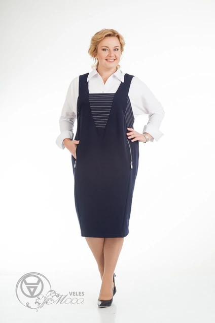 Оригинальный комплект двойка, из сарафана и блузки выглядит деловито и нарядно одновременно. Блуза цельновыкроена с рукавами, воротник сорочечного типа с отрезной стойкой, спереди застежка на планках с пуговицами, низ рукавов с отрезными деталями на пуговицах и отложными манжетами, фигурный низ разной высоты со спинкой. Сарафан с широкими бретелями, на спинке молния, в проймах и спереди вставки из декоративной ткани, спереди в швах функциональные карманы. Длина сарафана – 110 см., блузы – 78 см.