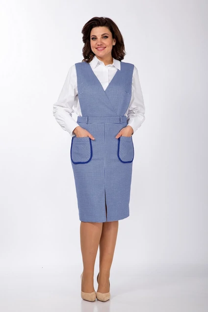 Комплект женский 2-х предметный, состоит из блузки и сарафана. Блуза прямого силуэта с центральной застёжкой, воротник с отрезной стойкой. Рукава длиные с притачными манжетами фигурной формы. Сарафан полуприлегающего силуэта, с притачным поясом, шлёвками, накладными карманами с застёжкой на потайную тесьму "молнию" в средних срезах задних половинок. Комплект укомплектован съёмным поясом из отделочной ткани. Длина блузы по спинке - 71,5 см. Длина рукава блузы - 54,5 см. Длина сарафана от пояса до низа - 63,5 см. Блуза: Хлопок - 95% Спандекс - 5%.
