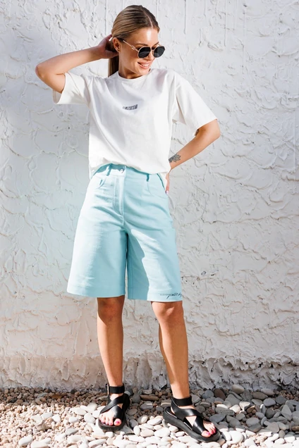 Шорты прямогосилуэта на притачном поясе с застежкой на молнию и кнопку.Спереди и сзади накладные карманы.По низу левой передней части декоративная надпись.