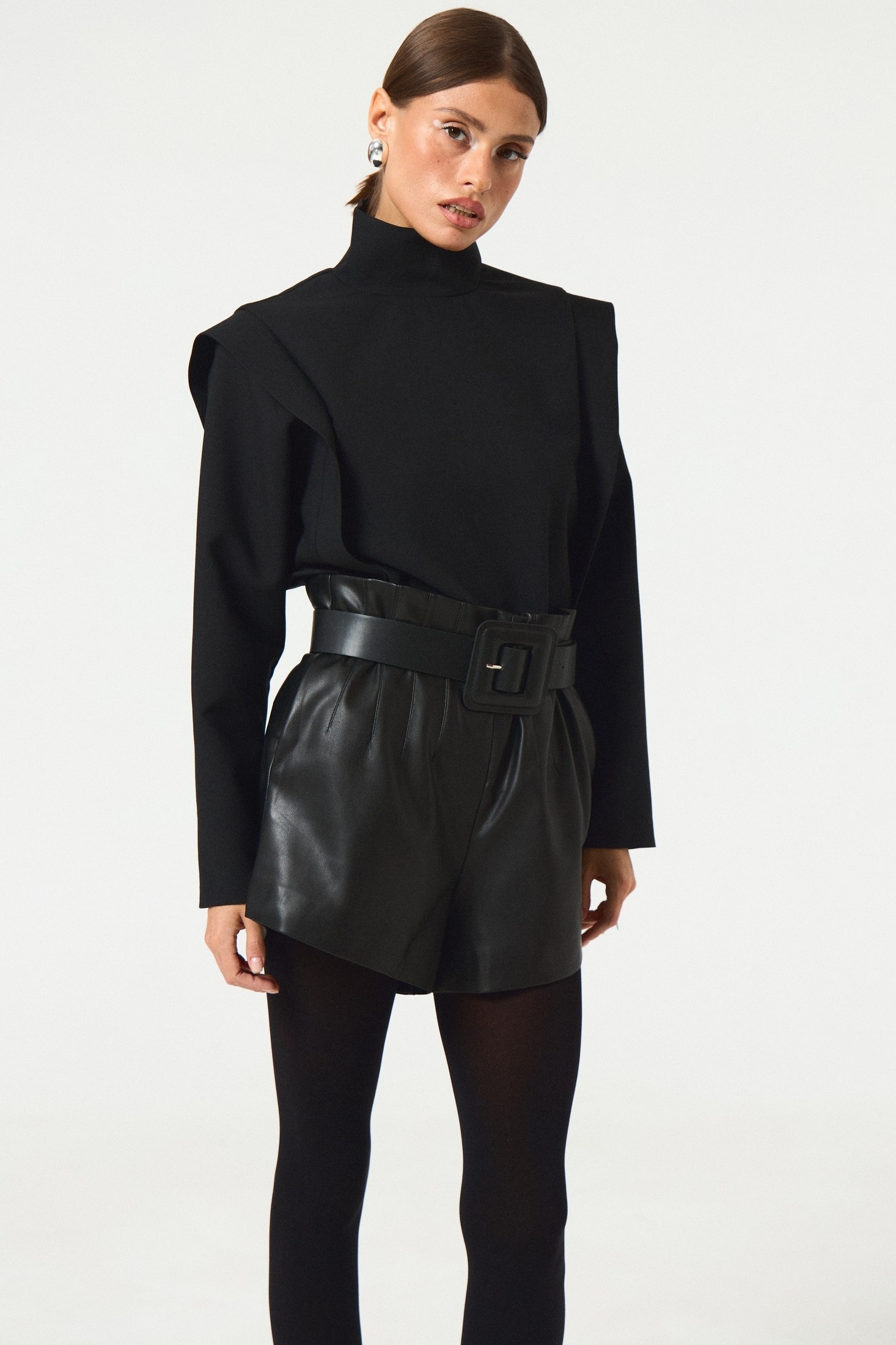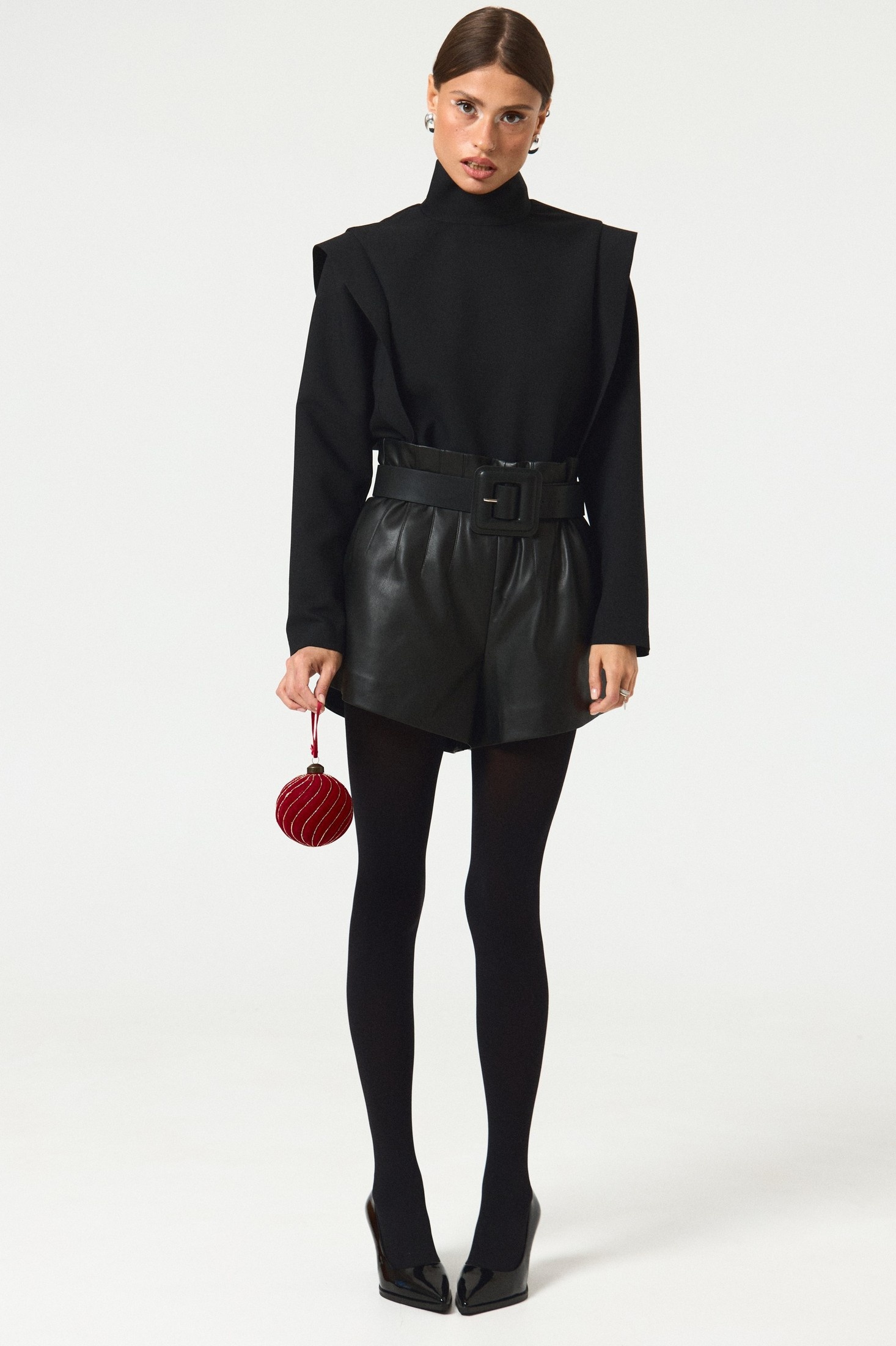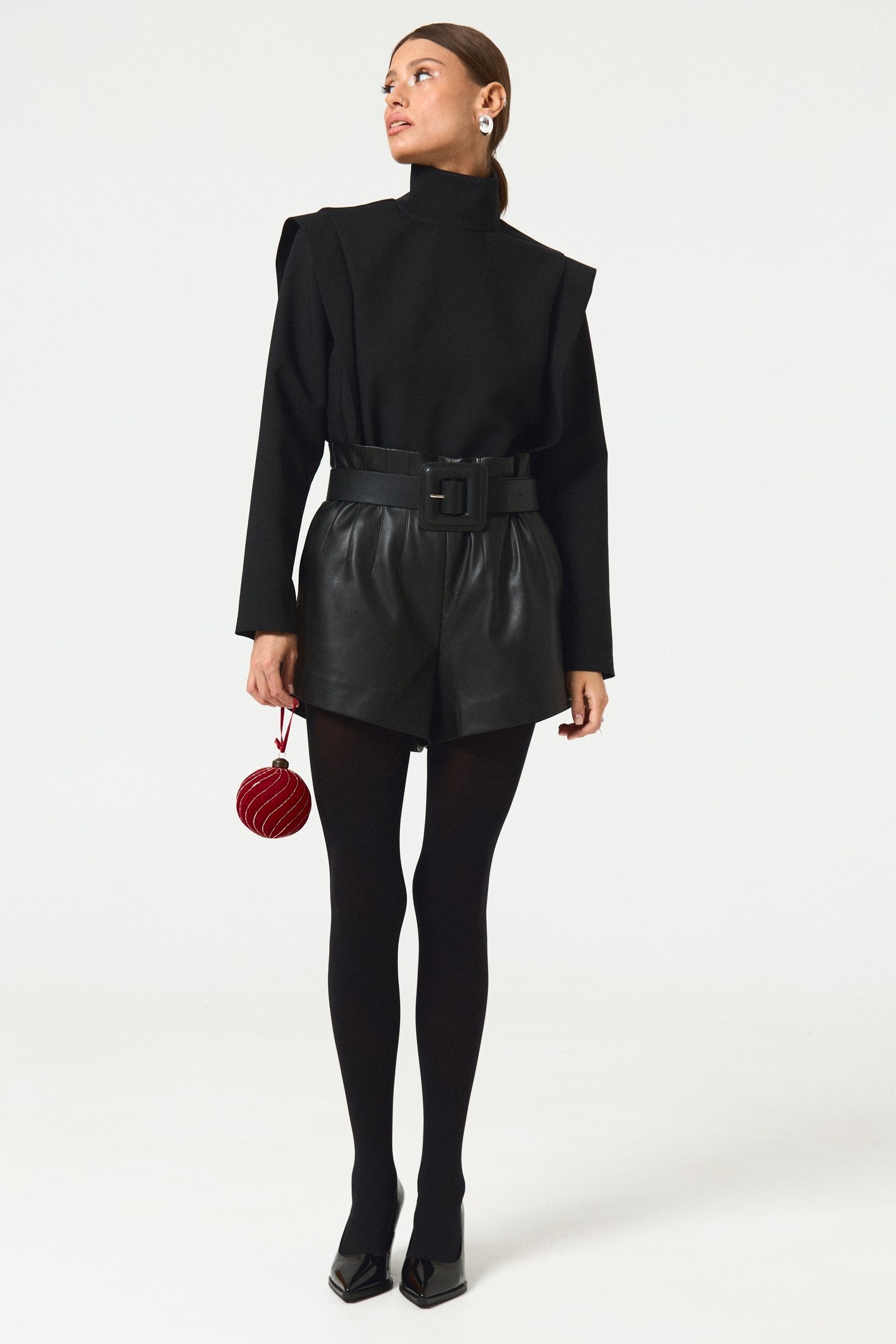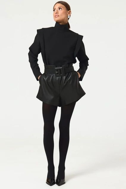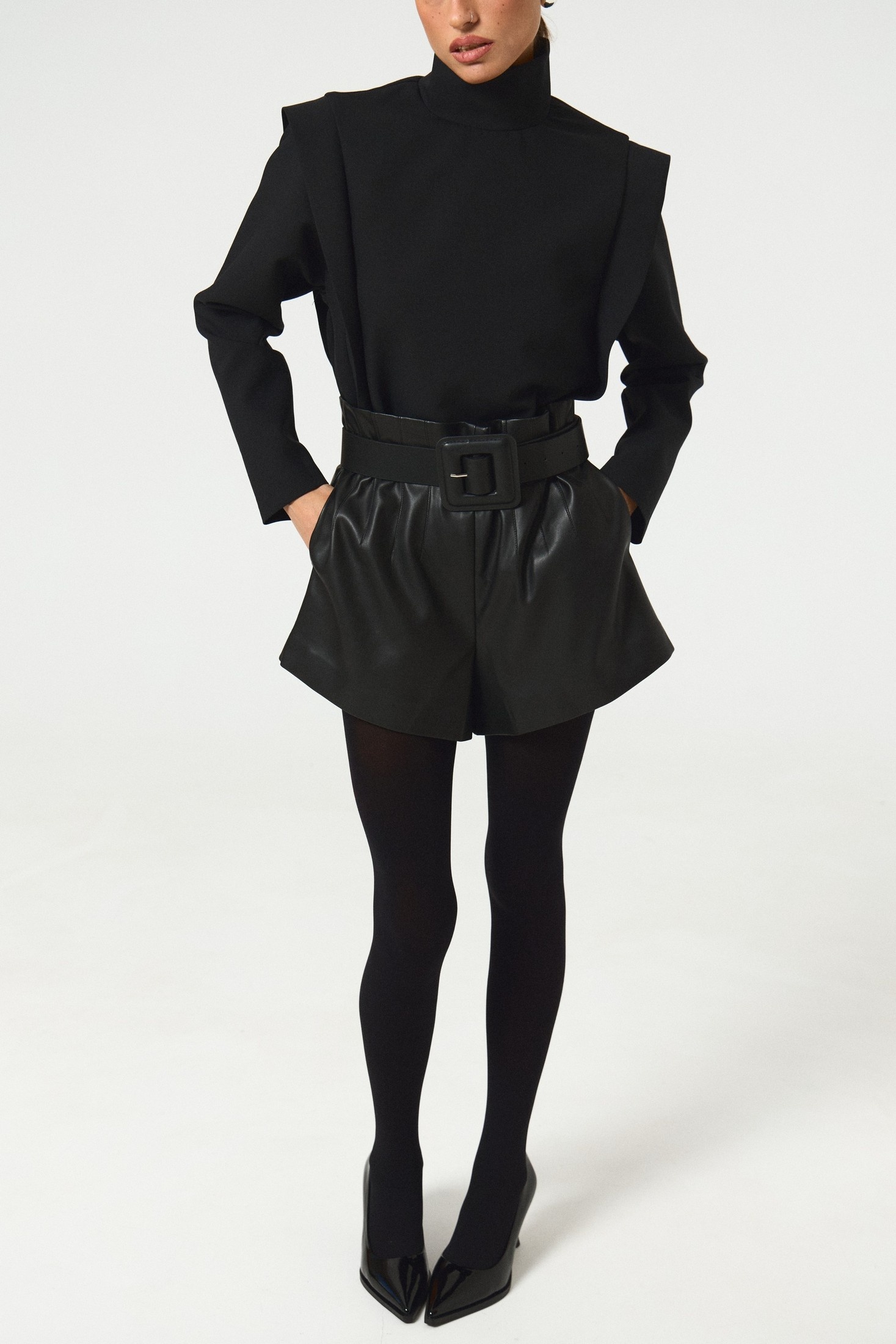 Элегантные черные шорты из экокожи - идеальный выбор для смелого и стильного образа. Модель мини-длины с высокой посадкой подчеркивает силуэт. В дизайне предусмотрены декоративные выточки на талии, добавляющие изысканности. Шорты оснащены потайной молнией на спинке, удобной для носки. Общая длина изделия составляет 42 см, что делает их идеальным выбором для современных городских нарядов.