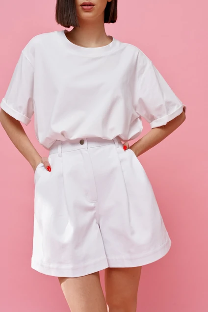 Шорты женские свободного кроя. Пояс стабильный, по поясу нашиты шлевки. Застежка -пуговичка, молния по переду изделия. По переду декоративные складки. В боковых швах карманы. По заднему полотну брюк крупные карманы. Длина изделия 45 см.