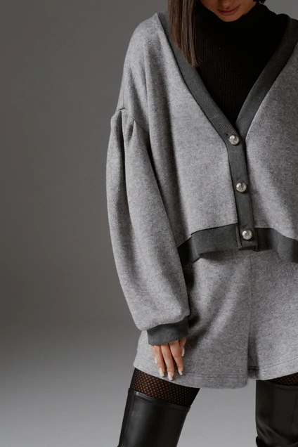 Шорты женские прямого свободного кроя выполнены из трикотажного вязанного полотна с люриксовой нитью. Пояс шорт на резинке со сборкой. Длина изделия 41 см.