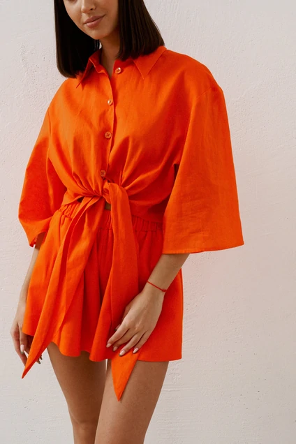Шорты прямого кроя выполнены из льняного полотна цвета мандарин. Яркая деталь Вашего образа. Идеально на море.