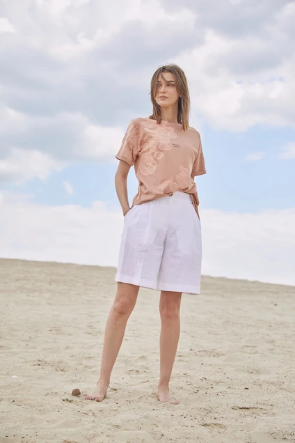 Шорты, расширенные к низу, со складками по переду, с притачным поясом, карманами и классической застежкой по центру переда на молнию и петлю-пуговицу на поясе. Задние карманы декорированы пришитой пуговицей. По низу шорт манжеты, по поясу шлевки
