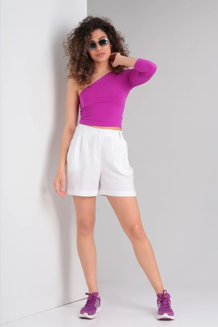 Шорты свободного силуэта с карманами, выполнены из натурального 100% льна. Пояс притачной, застежка молния, по низу отворот.