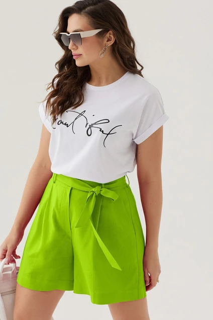 Шорты актуального силуэта из натурального льна. Шорты расширенные к низу на притачном поясе со шлевками и съемным поясом, со складками, с застежкой на петлю-пуговицу и карманами. Позади вытачки и резинка по центру. Длина изделия – 46 см.