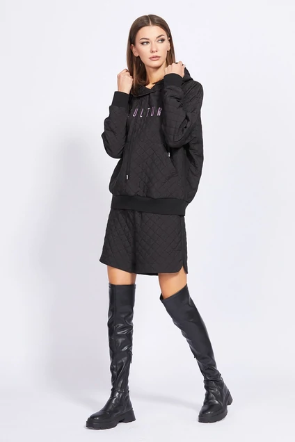Шорты выполнены из костюмно-плательной ткани, имитирующей стежку. Шорты на притачном поясе с эластичной тесьмой, прямого силуэта, длиной выше линии колена. Спереди боковый карманы с наклонным входом. В боковых швах фигурные разрезы.