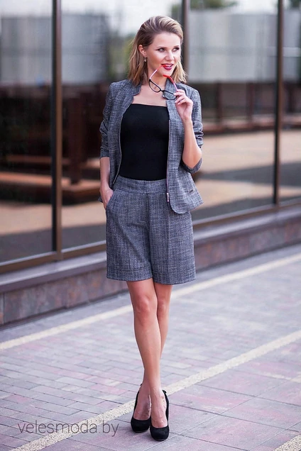 Шорты женские, расширенные к низу. По передней части изделия, в боковых швах, выполнены карманы с декоративными защипами-складками. Притачной пояс –кокетка. Застёжка –молния с гульфиком. По низу шорт выполнена широкая манжета, которая также может быть и отворотной. Длина изделия по боковому шву-45 см.Манжета не откладывается.