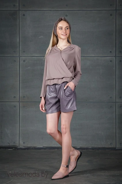 Шорты свободного кроя из кожи с карманом в боковом шве с мягкой сборкой по переду в поясе. Пояс притачной с застежкой по переду на молнию и двумя сквозными кнопками на поясе.
