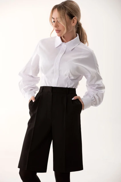 Шорты с отрезным поясом, с застежкой гульфик на молнию, с отрезным поясом, застегивающимся на крючок. Пояс со шлевками. В боковых швах расположены карманы.